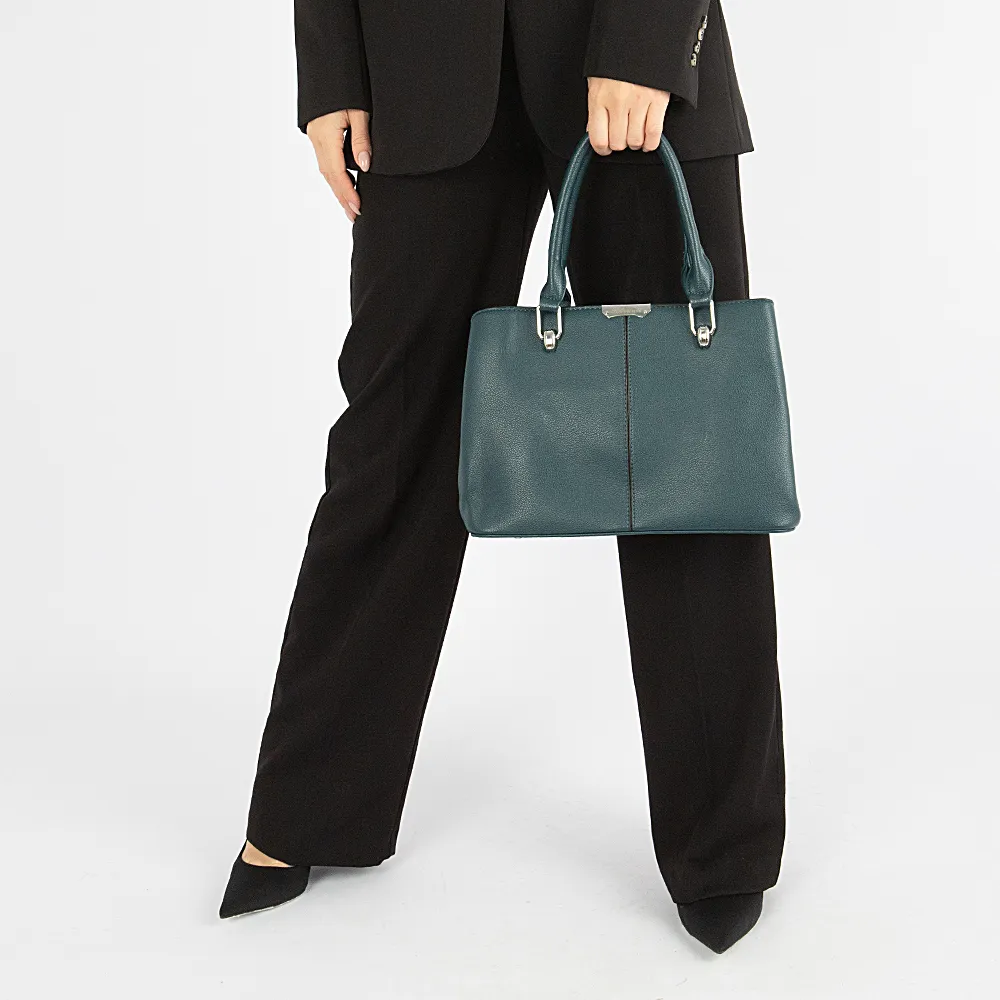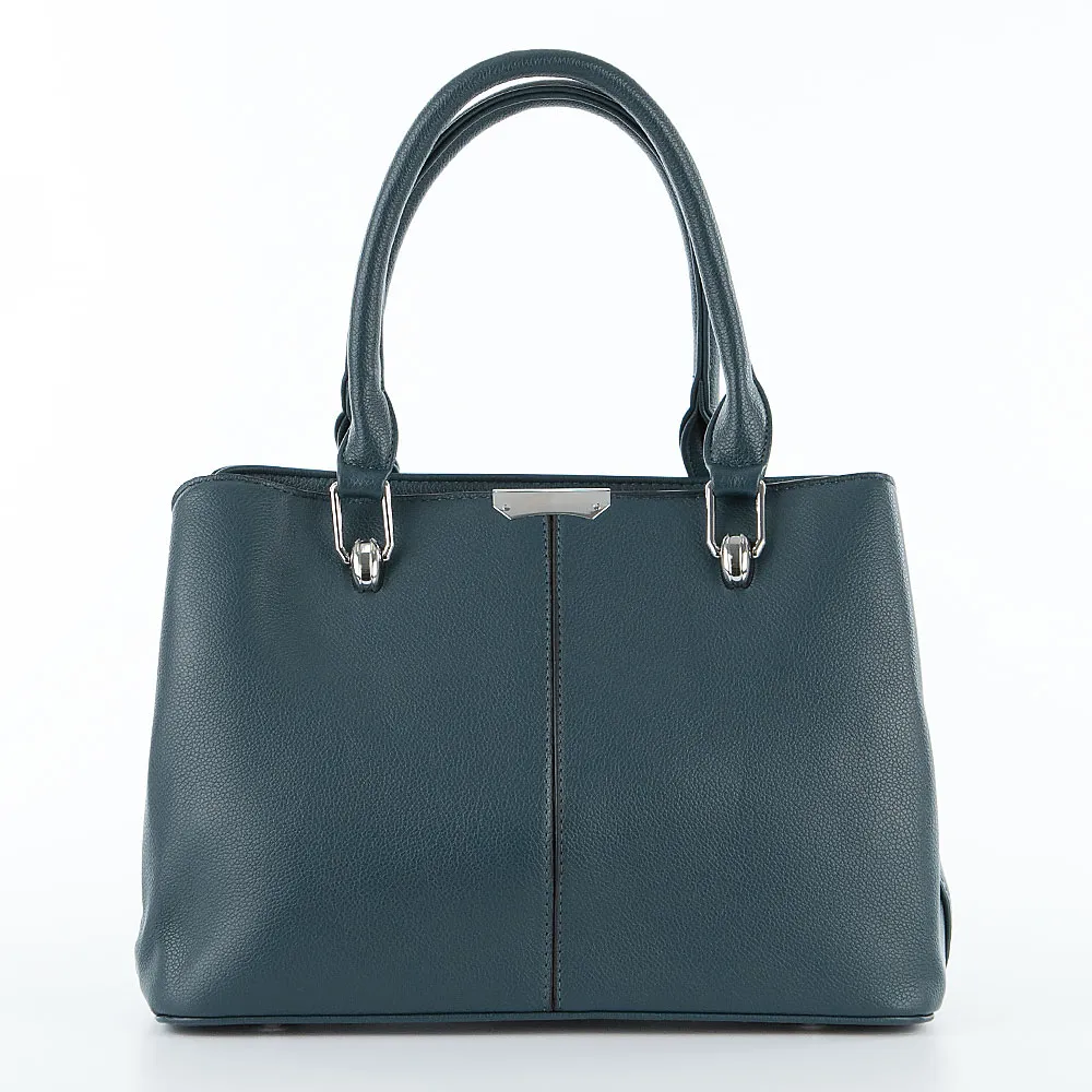 Сумка от торговой марки Passo Avanti из искусственной кожи синего цвета. Модель с двумя ручками и съемным плечевым ремнем. Отделение на молнии. Внутри: текстильная подкладка, средник и карман на молнии, два накладных кармана. На задней стороне – карман на молнии. Дно оснащено металлическими ножками для защиты от износа.