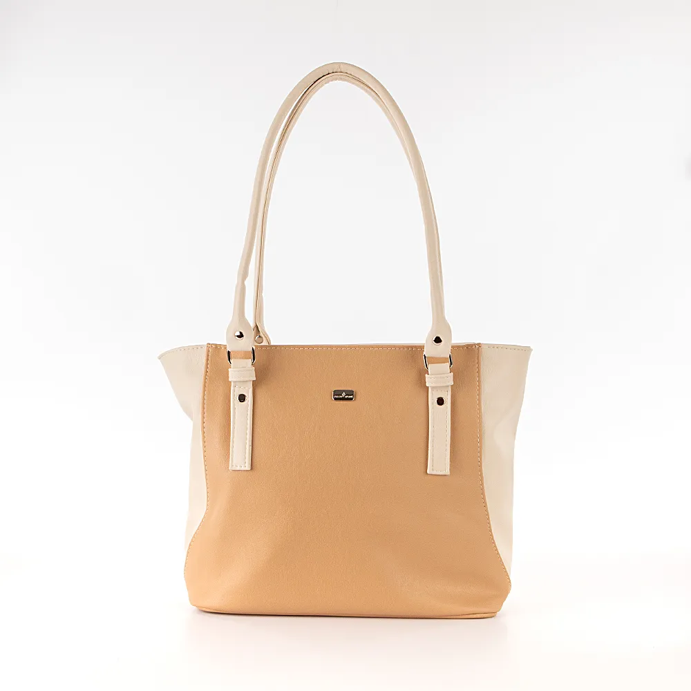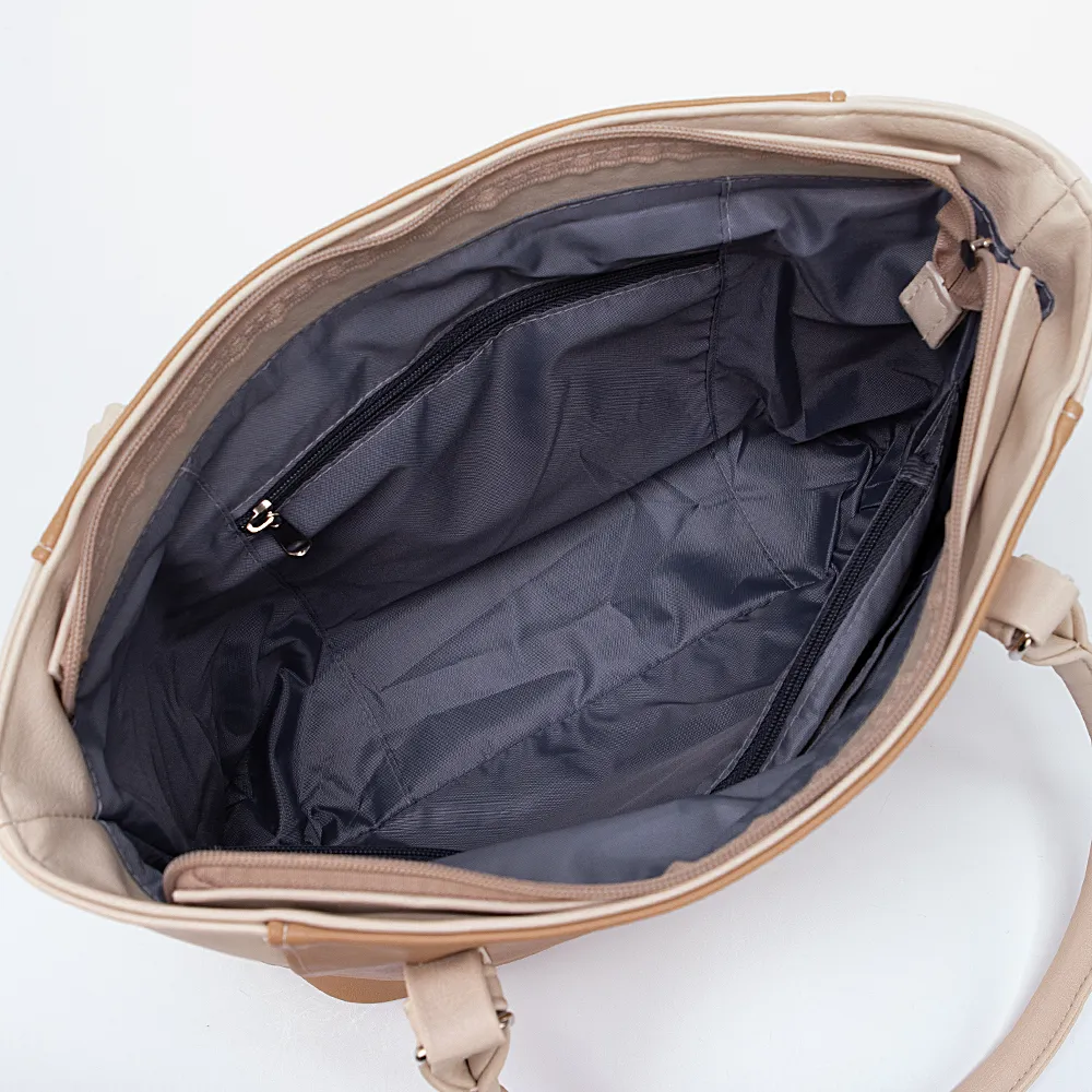 Сумка от торговой марки Passo Avanti из искусственной кожи в оттенках бежевого цвета. Модель с двумя удлиненными ручками. Отделение на молнии. Внутри: текстильная подкладка, карман на молнии, накладной карман, перегородка с карманом на молнии, образующая накладной карман. На задней стороне – карман на молнии.