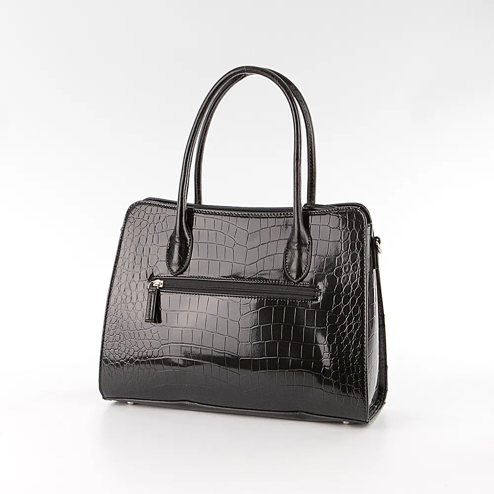Сумка от торговой марки Marzia из искусственной кожи черного цвета. Лицевая сторона декорирована лакированной вставкой с тиснением под крокодиловую кожу и бархатистой вставкой. Модель с двумя ручками и съемным плечевым ремнем. Отделение на молнии. Внутри: фирменная подкладка, средник и карман на молнии, два накладных кармана. На задней стороне - карман на молнии. Дно оснащено металлическими ножками для защиты от износа.