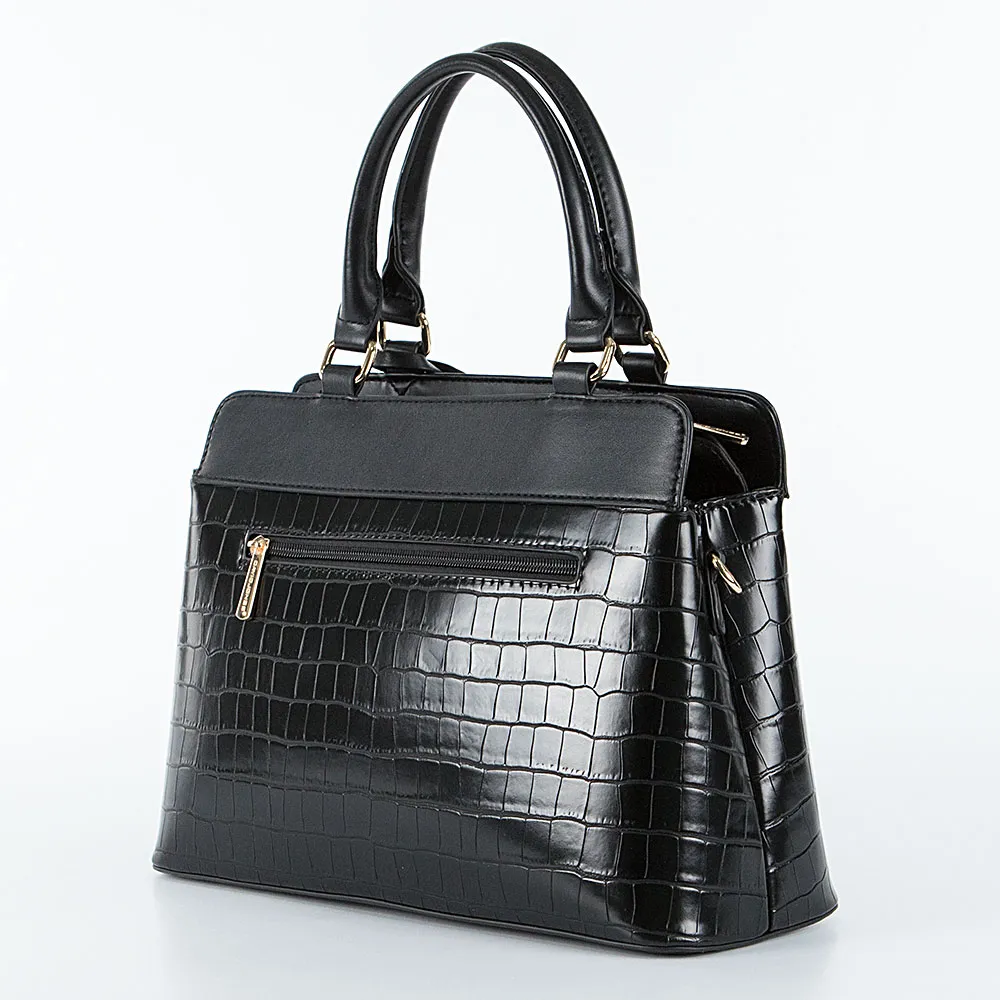 Сумка от торговой марки David Jones из искусственной кожи черного цвета с тиснением под крокодиловую кожу. Модель с двумя ручками, декорированными подвеской, и съемным регулируемым плечевым ремнем. Отделение на молнии. Внутри: средник и карман на молнии, накладной карман. На лицевой стороне – декоративные элементы. На задней стороне – карман на молнии.