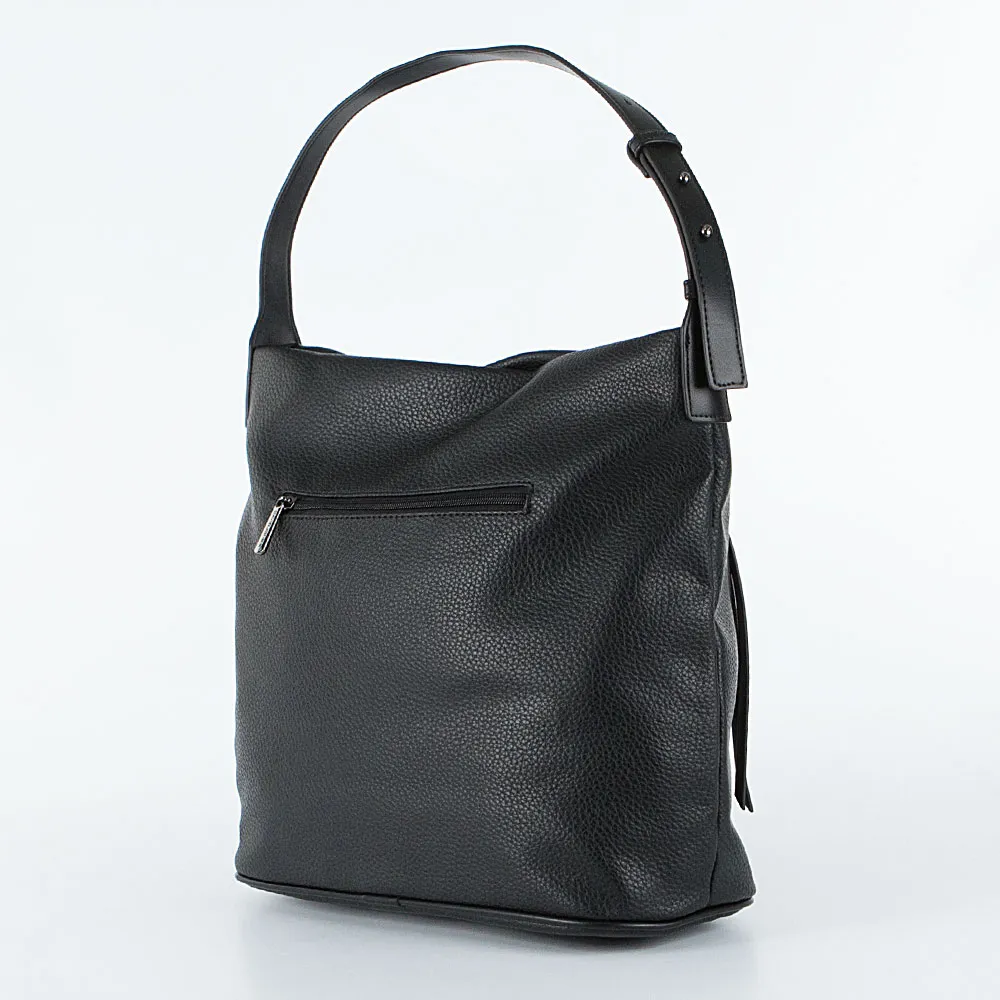 Сумка от торговой марки David Jones из искусственной кожи черного цвета. Модель с одной регулируемой ручкой с кобурными кнопками. Отделение на молнии. Внутри: фирменная подкладка, карман на молнии, накладной карман. На лицевой и задней сторонах – карман на молнии.