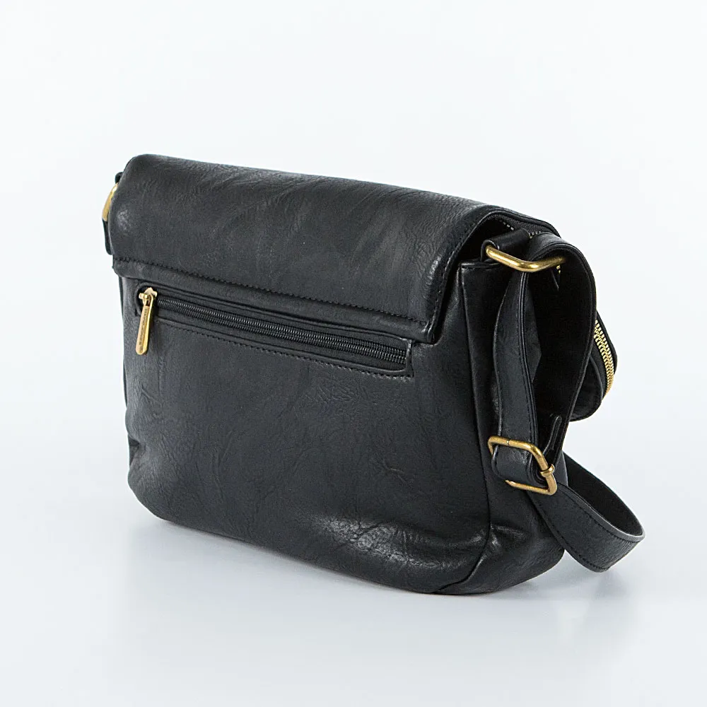 Сумка от торговой марки David Jones из искусственной кожи черного цвета. Модель с несъемным регулируемым плечевым ремнем. Клапан на магнитной кнопке закрывает накладной карман и отделение на молнии; на клапане имеется карман на молнии. В отделении: фирменная подкладка, карман на молнии, накладной карман. На задней стороне – карман на молнии.