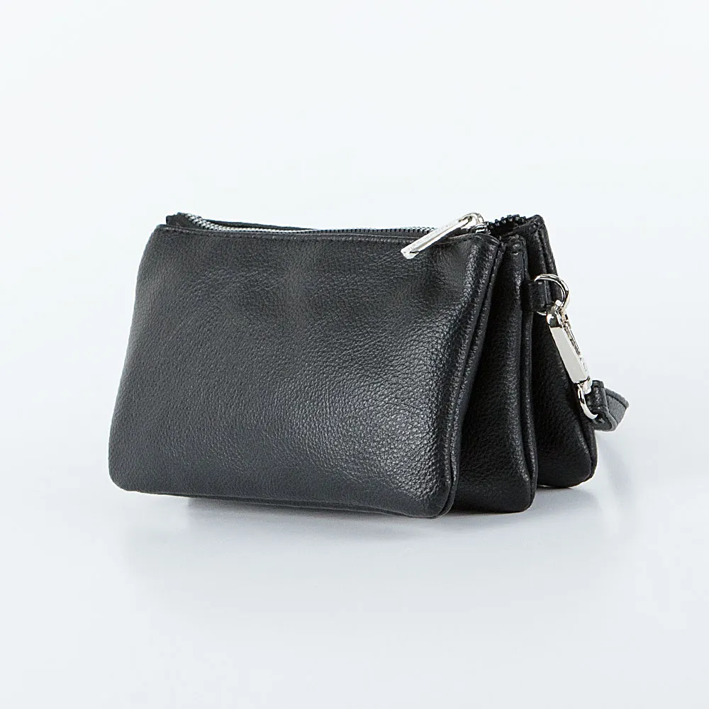 Сумка от торговой марки David Jones из искусственной кожи черного цвета. Компактная модель кросс-боди со съемным регулируемым плечевым ремнем. Закрывается молнией. Внутри: три отсека с фирменной подкладкой, в заднем отсеке – карман на молнии.