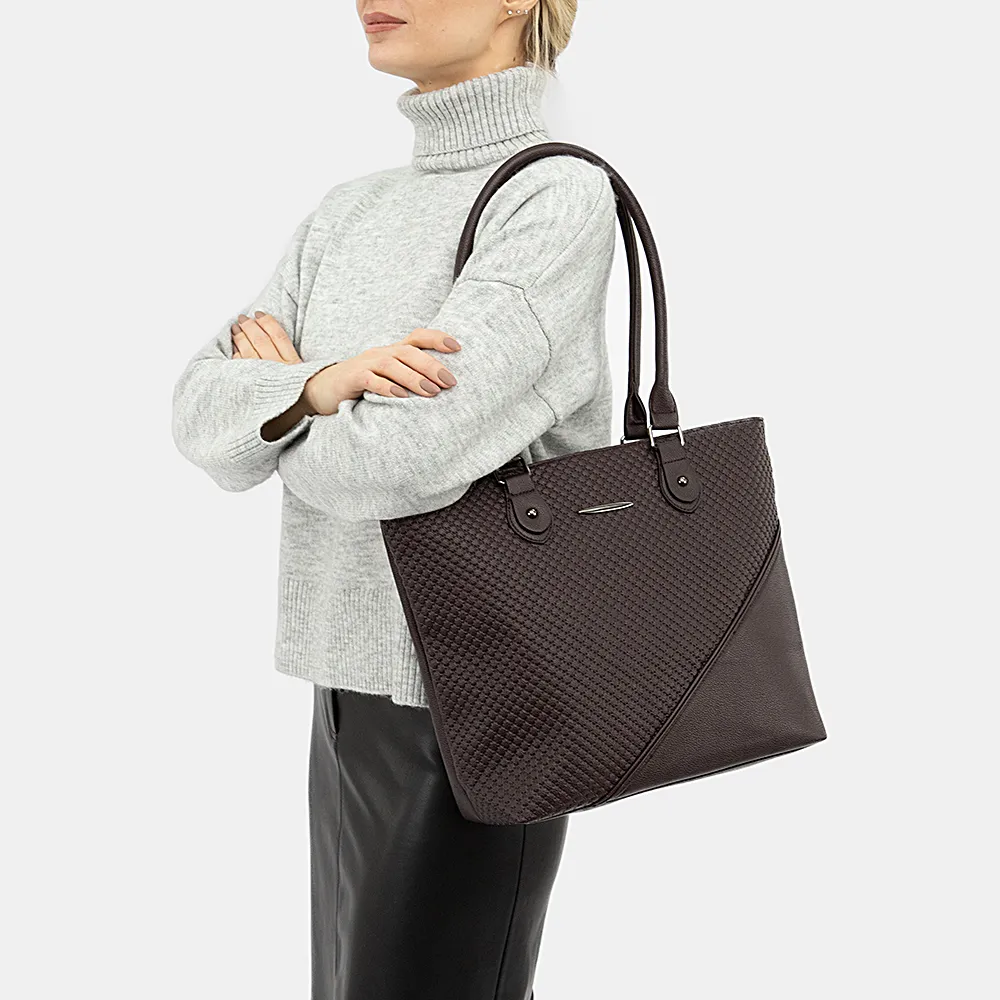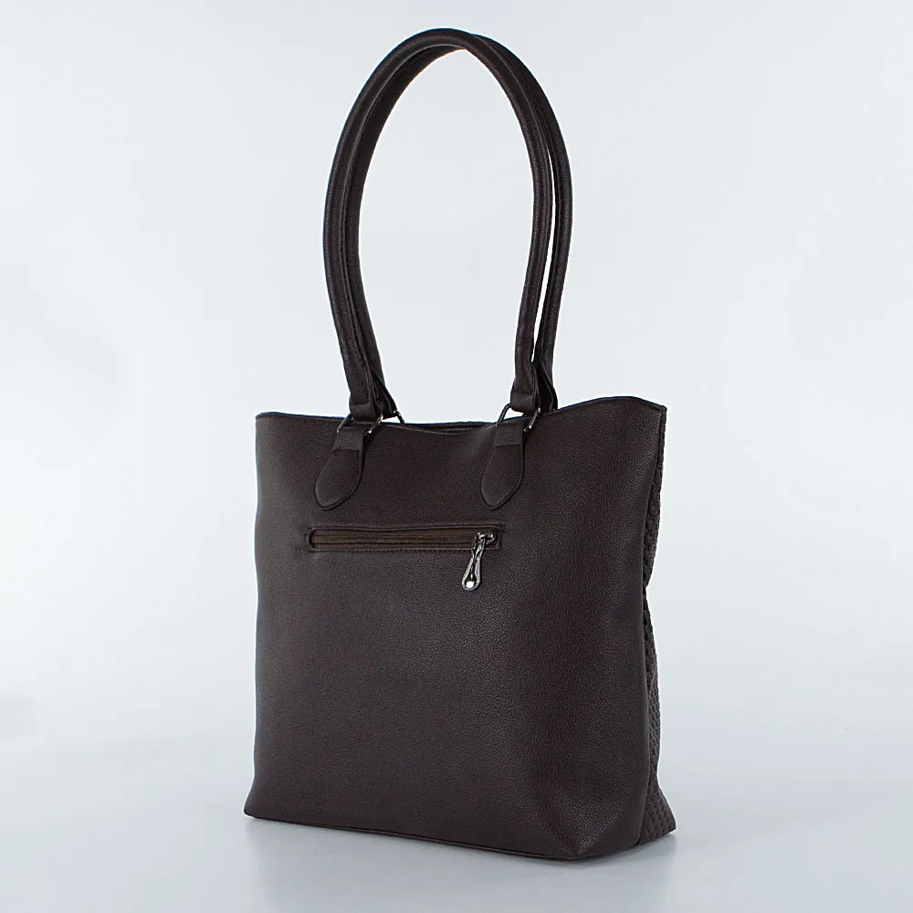 Сумка от торговой марки Passo Avanti из искусственной кожи коричневого цвета. Лицевая сторона декорирована узорным тиснением. Модель с двумя удлиненными ручками. Два отделения на молнии, с текстильной подкладкой. В одном из отделений – карман на молнии, в другом – накладной карман. На задней стороне – карман на молнии.
