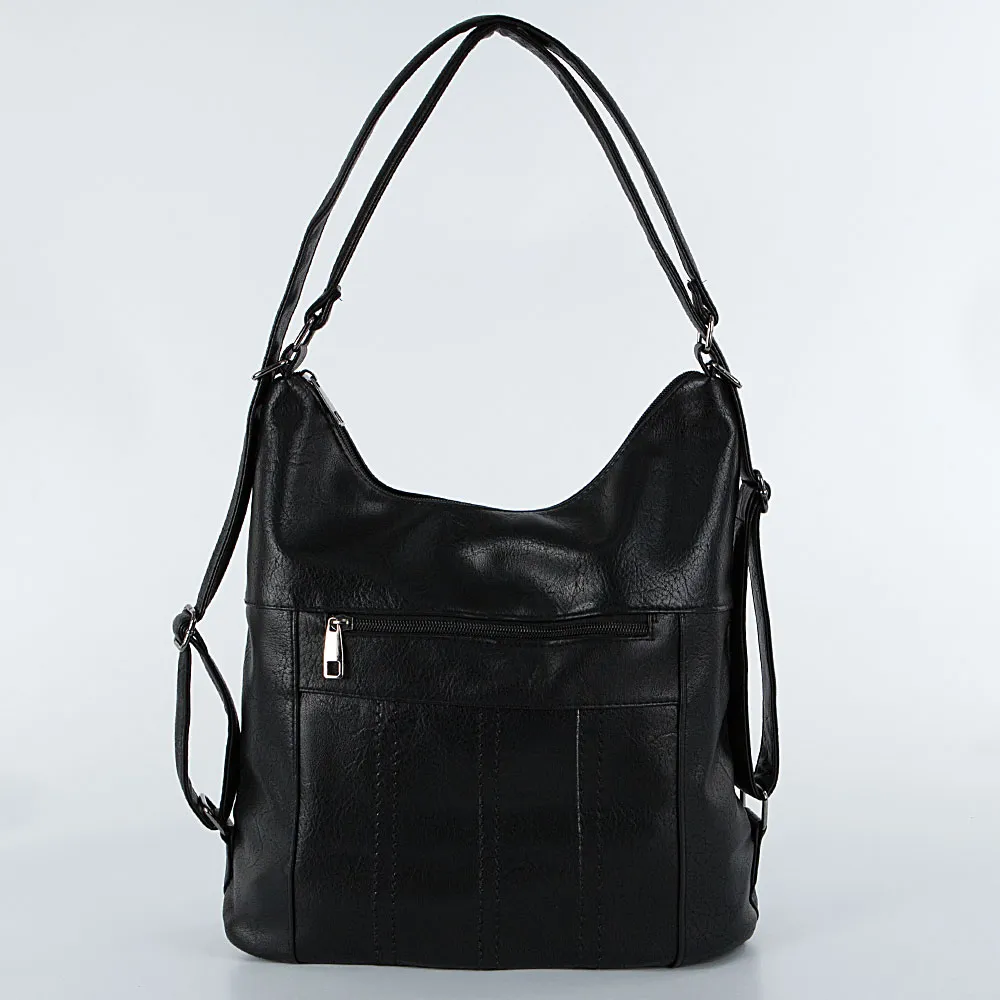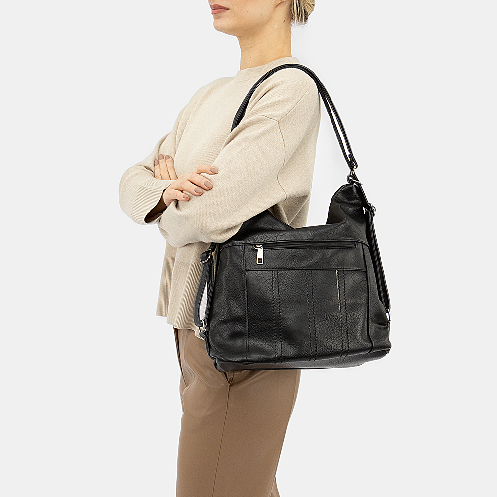 Сумка-рюкзак от торговой марки Passo Avanti из искусственной кожи черного цвета. Модель с двумя ручками, которые стягиваются в плечевые лямки. Отделение на молнии. Внутри: текстильная подкладка, средник и карман на молнии, два накладных кармана. На лицевой и задней сторонах – карман на молнии. Дно сумки овальной формы.