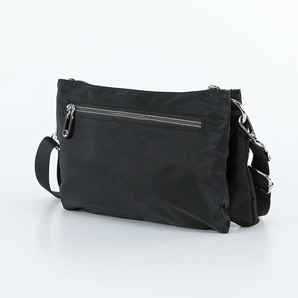 Сумка от торговой марки Valigetti из текстильного материала черного цвета. Модель со съемным регулируемым плечевым ремнем. Закрывается молнией. Внутри: три отсека, текстильная подкладка; в одном из отделений – карман на молнии, в другом – два накладных кармана. На лицевой стороне – два кармана на молнии, кармашек без застежки. На задней стороне – карман на молнии.
