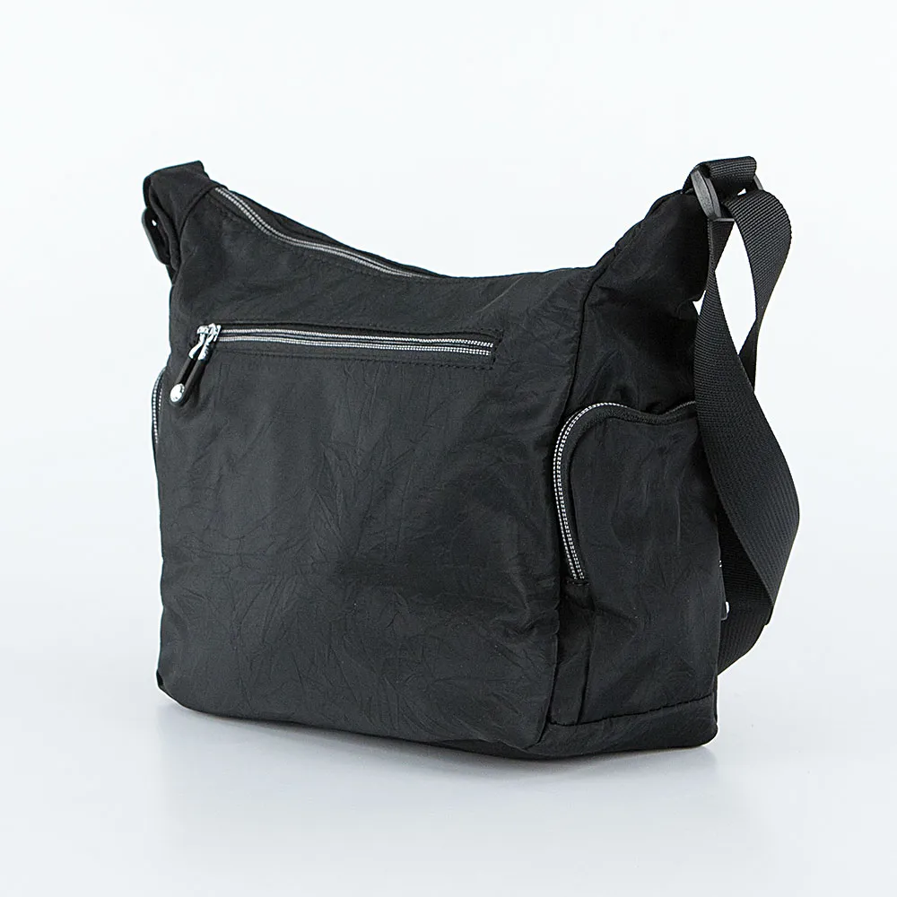 Сумка от торговой марки Valigetti из текстильного материала черного цвета. Модель с несъемным регулируемым плечевым ремнем. Отделение на молнии. Внутри: фирменная подкладка, карман на молнии, два накладных кармана. Снаружи имеется пять карманов на молнии: спереди, по бокам и на задней стороне.