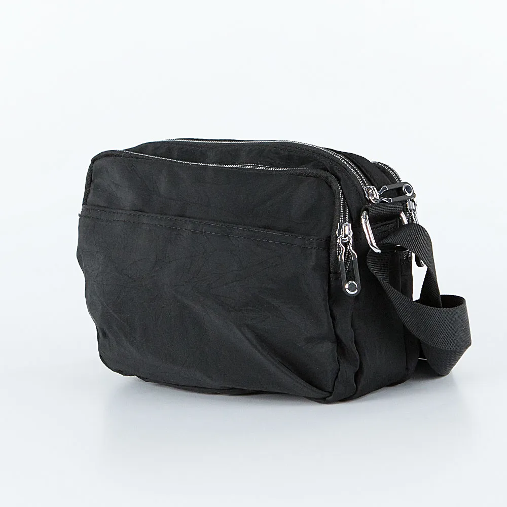 Сумка от торговой марки Valigetti из текстильного материала черного цвета. Компактная модель с несъемным регулируемым плечевым ремнем. Три отделения на молнии, с текстильной подкладкой. В одном из отделений – карман на молнии. На лицевой и задней сторонах - карман на скрытой молнии.
