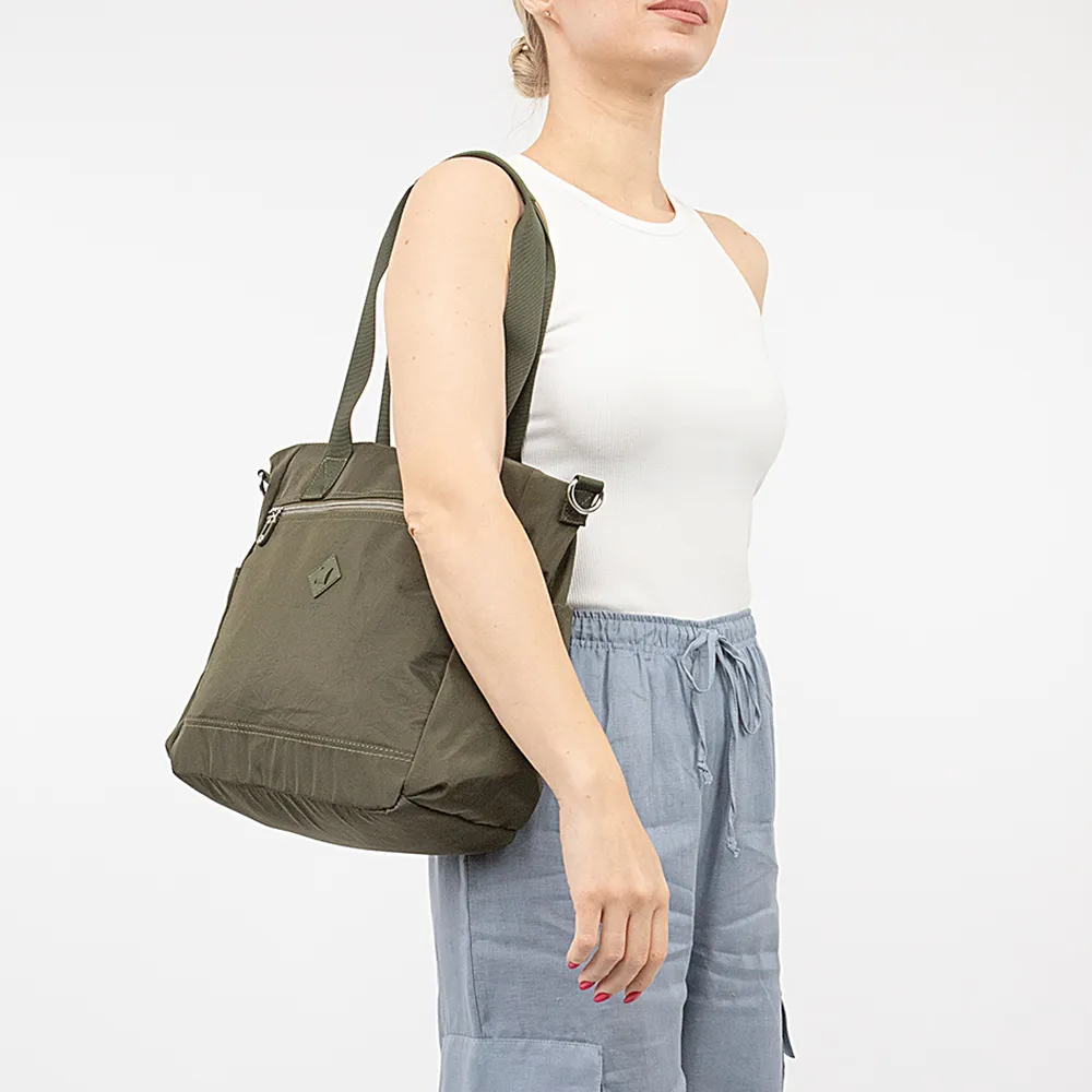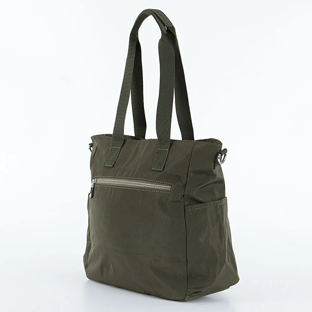 Сумка от торговой марки Valigetti из практичного текстильного материала цвета хаки. Модель с двумя удлиненными ручками и съемным регулируемым плечевым ремнем. Отделение на молнии. Внутри: фирменная подкладка, карман на молнии, два накладных кармана. На лицевой стороне – карман на молнии. По бокам – карман без застежки. На задней стороне – карман на молнии.