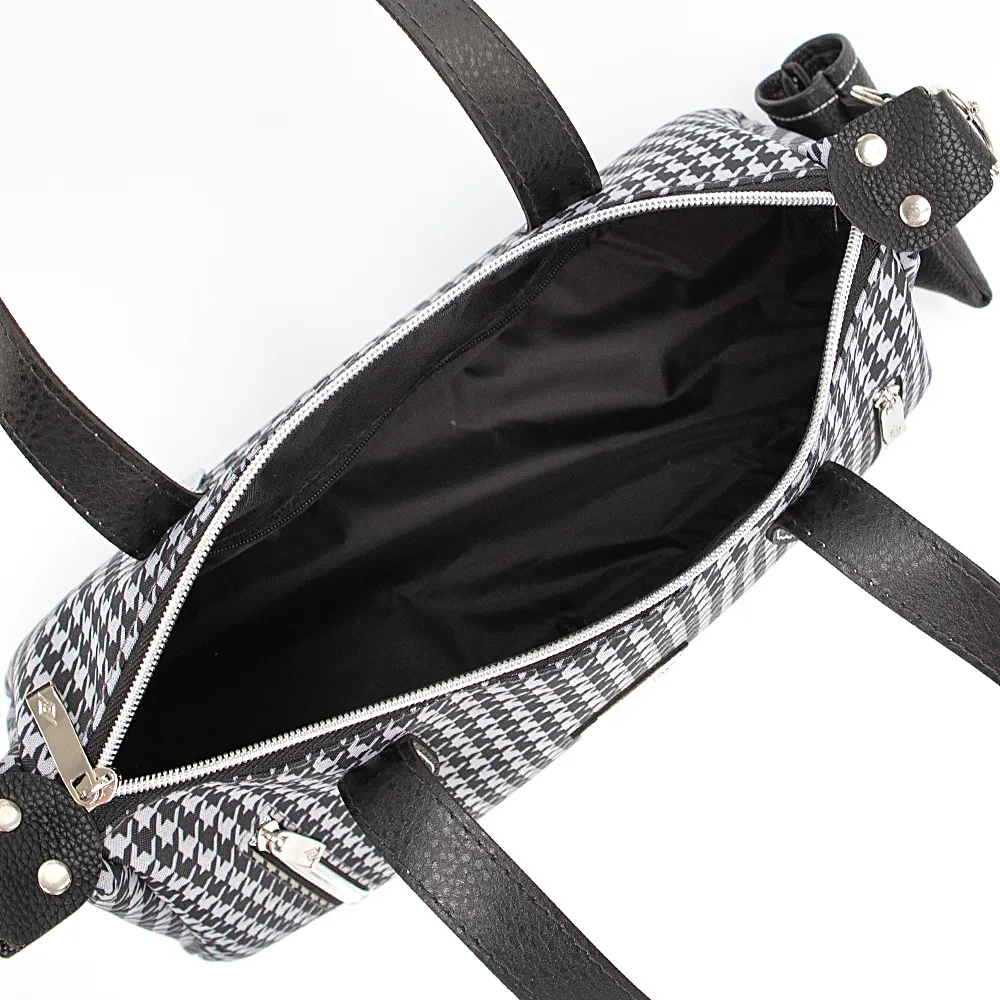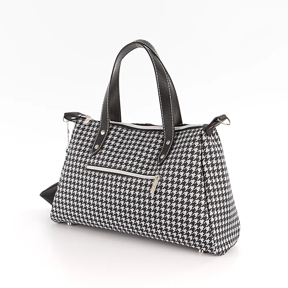 Сумка от торговой марки Passo Avanti из текстильного материала и искусственной кожи в сочетании черного и белого цвета с принтом «гусиная лапка». Модель с двумя ручками и съемным плечевым ремнем. Отделение на молнии. Внутри: текстильная подкладка, карман на молнии, два накладных кармана. На лицевой стороне – два кармана на молнии. На задней стороне – карман на молнии. Дно оснащено металлическими ножками для защиты от износа. В комплекте имеется ключница с отделением без застежки.