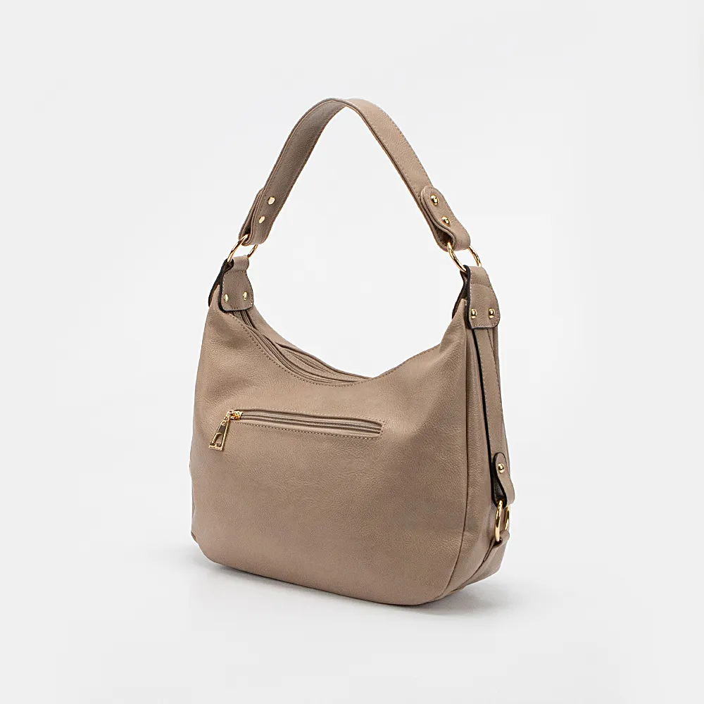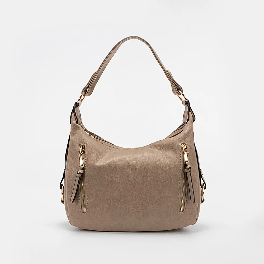 Сумка от торговой марки Passo Avanti из искусственной кожи кофейного цвета. Модель с одной широкой ручкой. Два отделения на молнии, с текстильной подкладкой. В заднем – карман на молнии, в переднем – два накладных кармана. На лицевой стороне – два вертикальных кармана на молнии. На задней стороне – карман на молнии.
