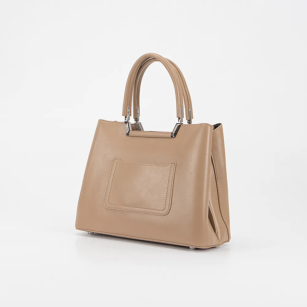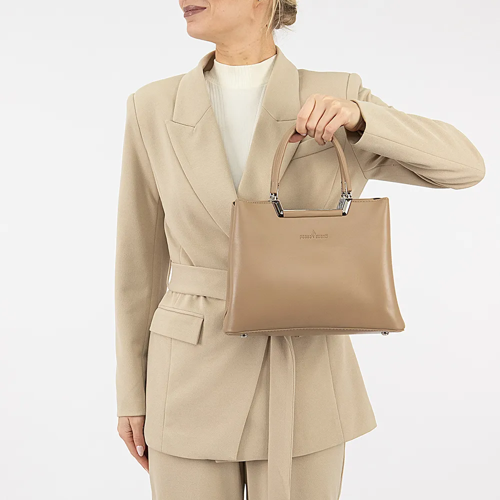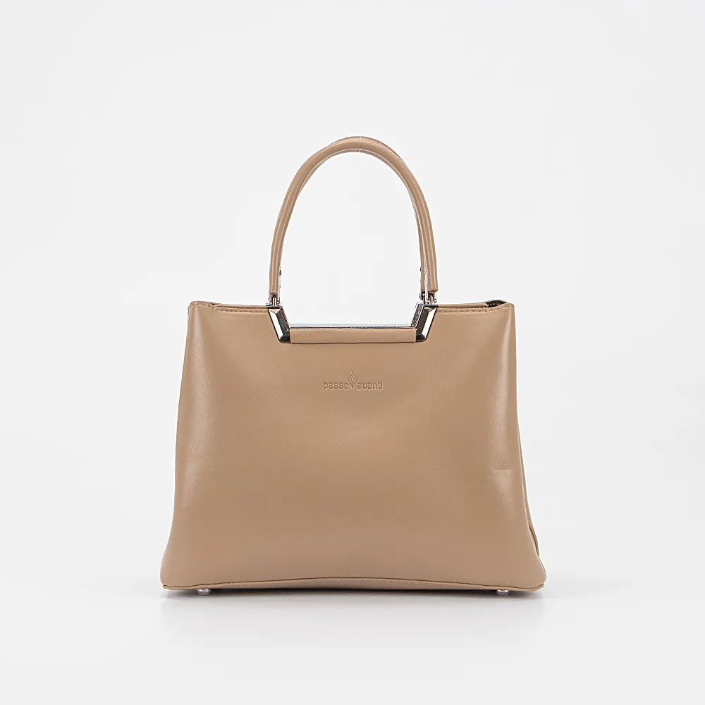 Сумка от торговой марки Passo Avanti из искусственной кожи кофейного цвета. Модель с двумя плотными ручками и съемным регулируемым плечевым ремнем. Отделение на молнии, с частичной подкладкой. Внутри: три отсека, в среднем: накладной карман и карман на молнии. На задней стороне – накладной кармашек для карт. Дно оснащено металлическими ножками для защиты от износа.