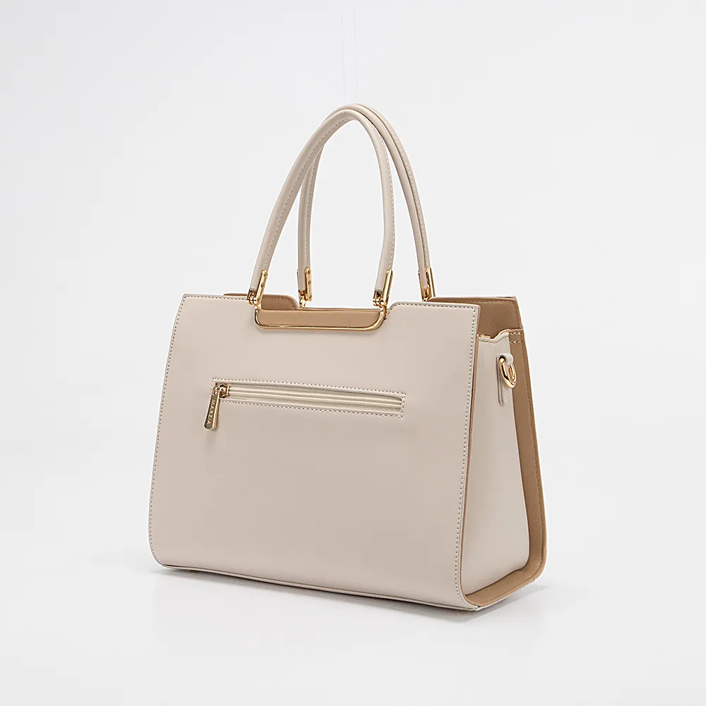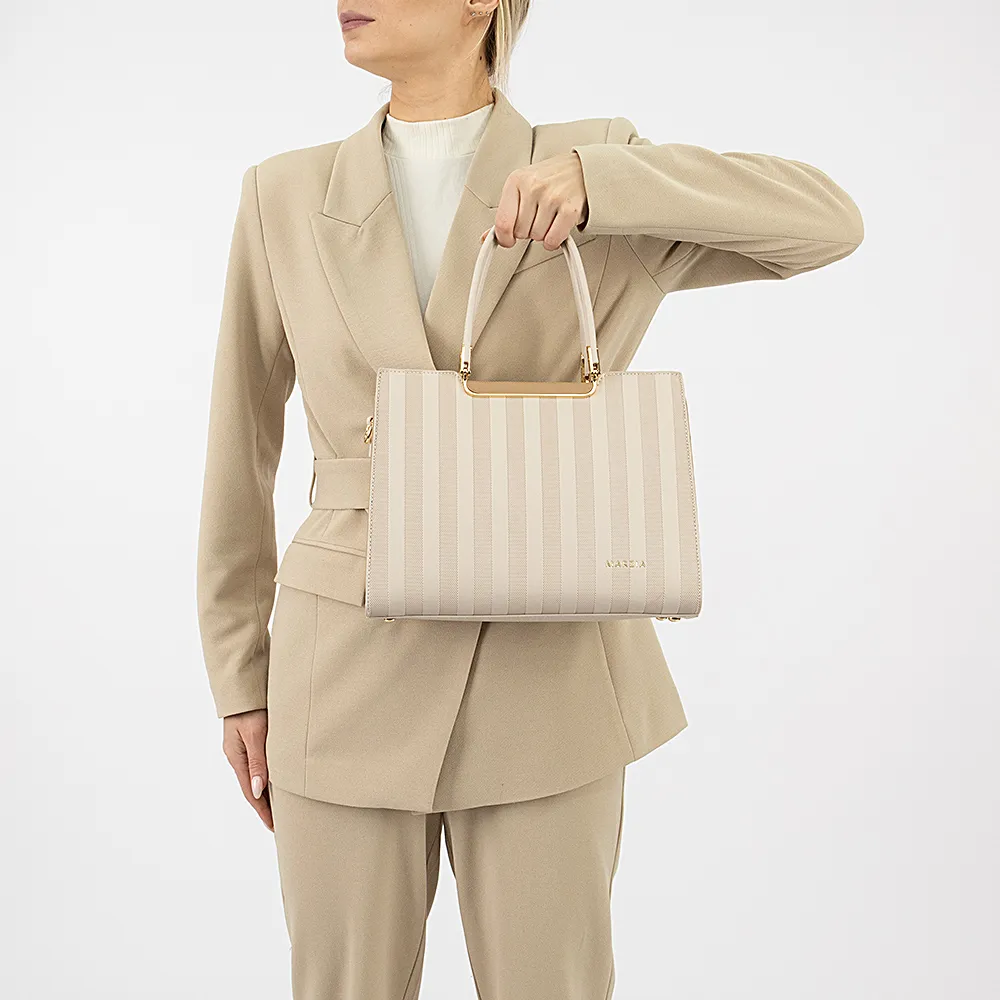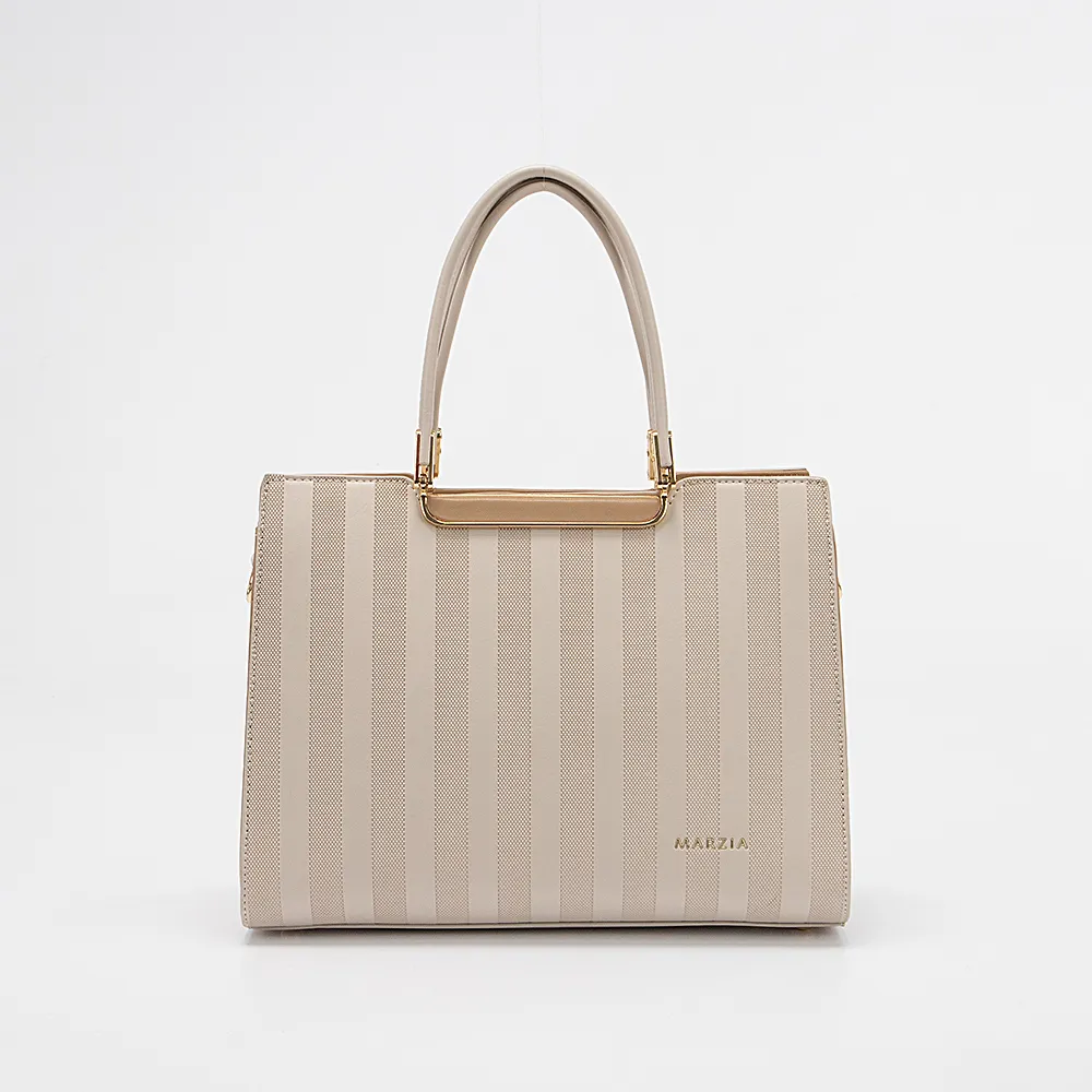 Сумка от торговой марки Marzia из искусственной кожи бежевого цвета. Декорирована оригинальным тиснением, чередующимся вертикальными полосами. Модель с двумя удлиненными ручками и съемным регулируемым плечевым ремнем. Отделение на молнии. Внутри: текстильная подкладка, средник и карман на молнии. На задней стороне – карман на молнии. Дно оснащено металлическими ножками для защиты от износа.