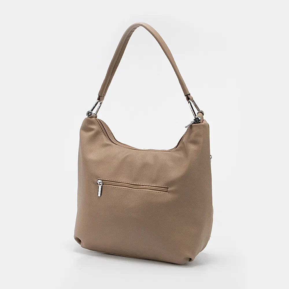 Сумка от торговой марки Passo Avanti из искусственной кожи бежевого цвета. Вместительная модель с одной широкой ручкой на оригинальных кольцах. Два отделения на молнии, с текстильной подкладкой. В заднем отделении – карман на молнии, в переднем – два накладных кармана. По бокам – вертикальный карман на молнии. На задней стороне – карман на молнии.