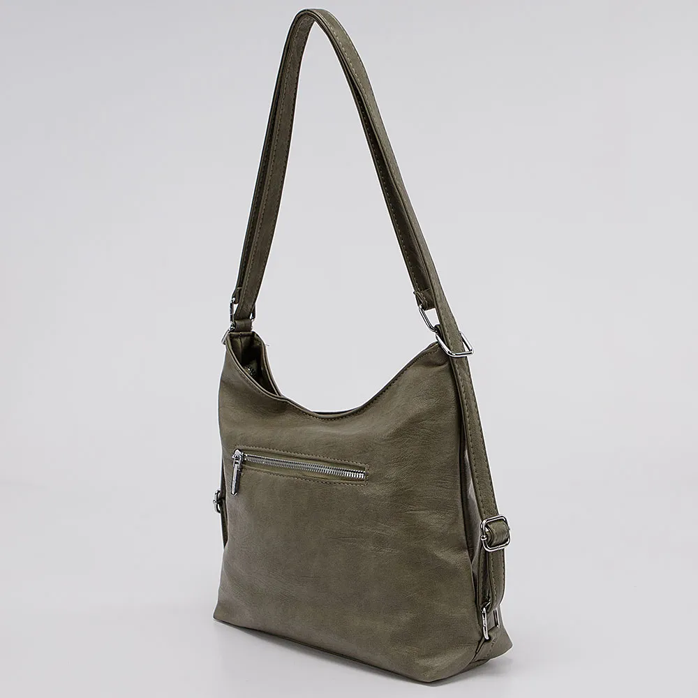 Сумка-рюкзак от торговой марки Passo Avanti из искусственной кожи цвета хаки. Модель среднего размера, с двумя ручками, которые стягиваются в плечевые лямки. Отделение на молнии. Внутри: текстильная подкладка, карман на молнии, два накладных кармана. На задней стороне – карман на молнии.
