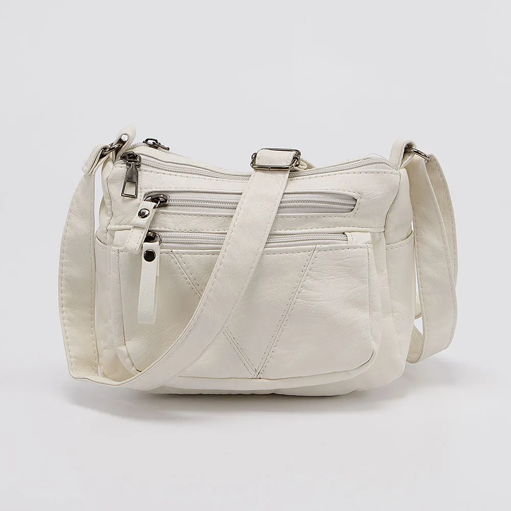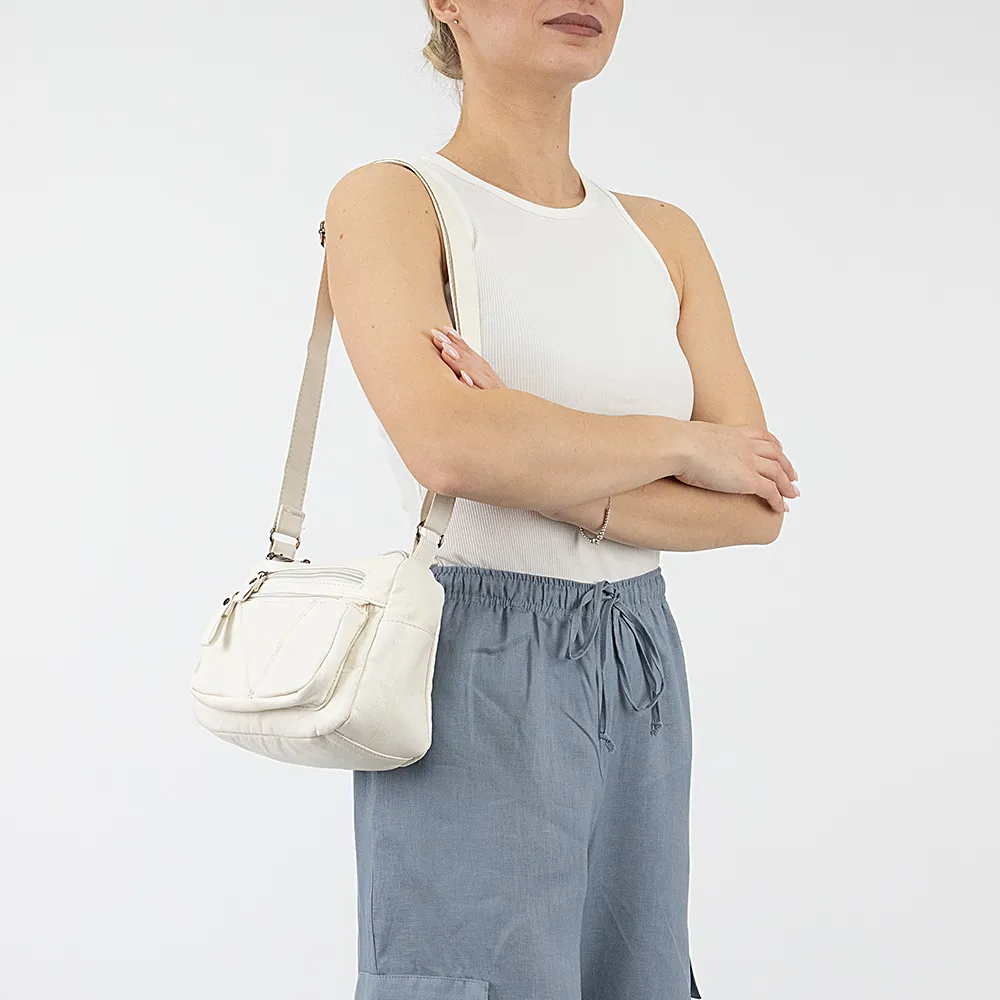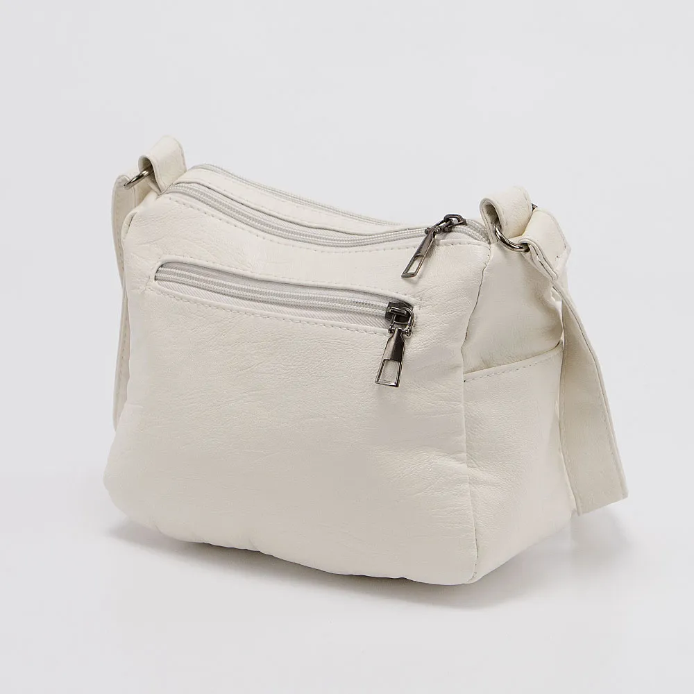 Сумка от торговой марки Passo Avanti из искусственной кожи белого цвета. Компактная миниатюрная модель с несъемным регулируемым плечевым ремнем. Два отделения на молнии, с текстильной подкладкой. В одном из отделений – карман на молнии. На лицевой стороне, декорированной вставками, имеется два кармана на молнии. По бокам – накладной карман без застежки. На задней стороне – карман на молнии.