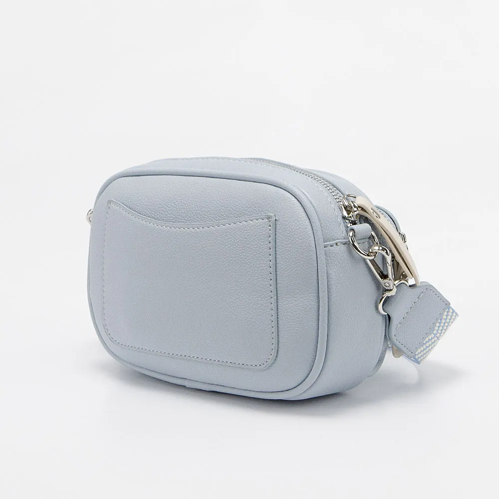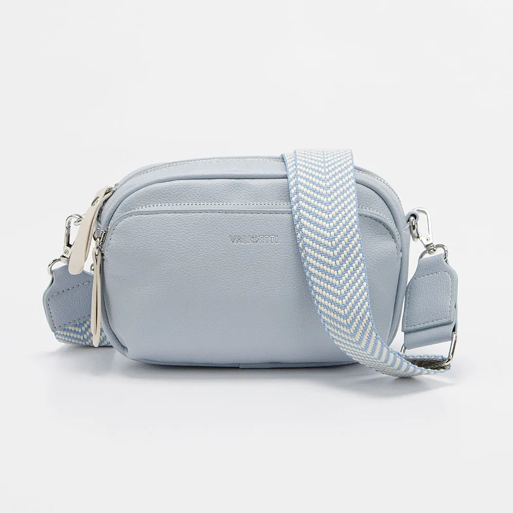 Сумка от торговой марки Valigetti из искусственной кожи голубого цвета. Модель со съемным регулируемым плечевым ремнем, выполненным из текстильного материала с оригинальным рисунком «елочкой». Отделение на молнии. На лицевой стороне – карман на молнии. На задней стороне – накладной карман для карт.