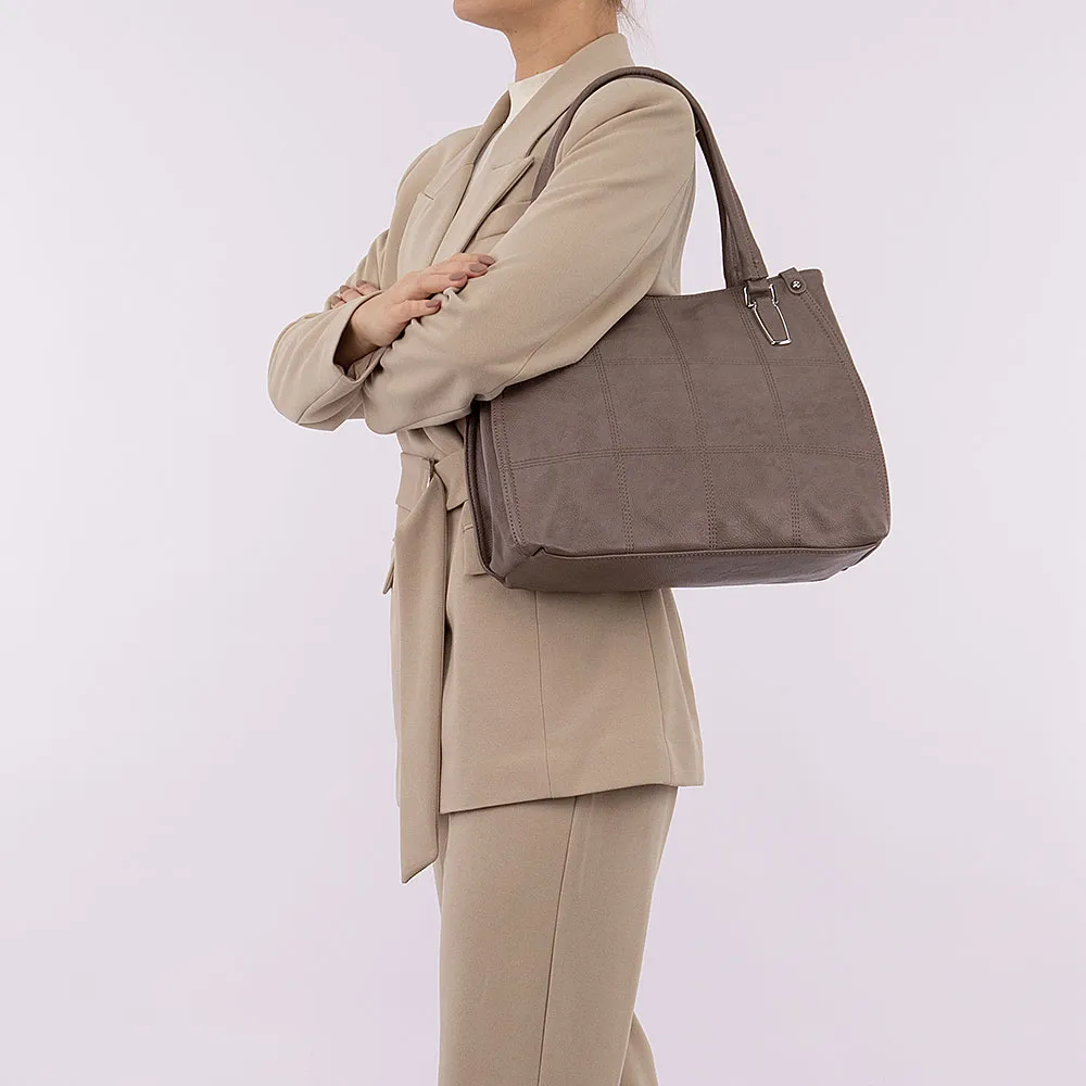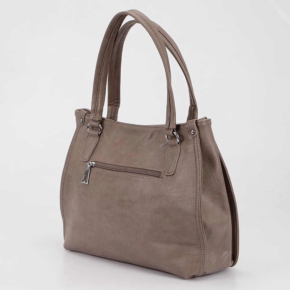 Сумка от торговой марки Passo Avanti выполнена из искусственной кожи кофейного цвета. Вместительная модель с двумя удлиненными ручками. Отделение на молнии. Внутри: текстильная подкладка, средник и карман на молнии, два накладных кармана. На задней стороне – карман на молнии. Передняя сторона декорирована отстрочкой.