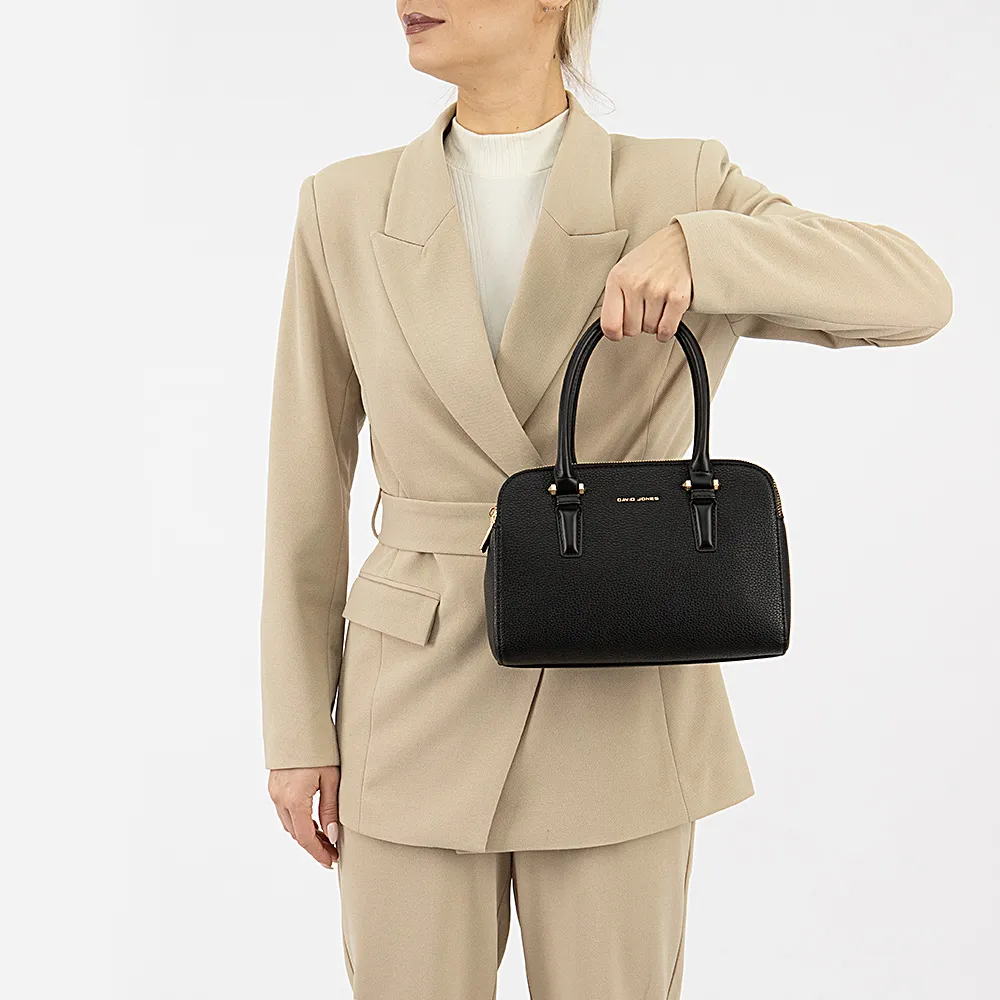 Сумка от торговой марки David Jones из искусственной кожи черного цвета. Компактная модель с двумя удлиненными ручками и съемным плечевым ремнем. Три отделения на молнии, с фирменной подкладкой. В среднем отделении – карман на молнии, два накладных кармана.