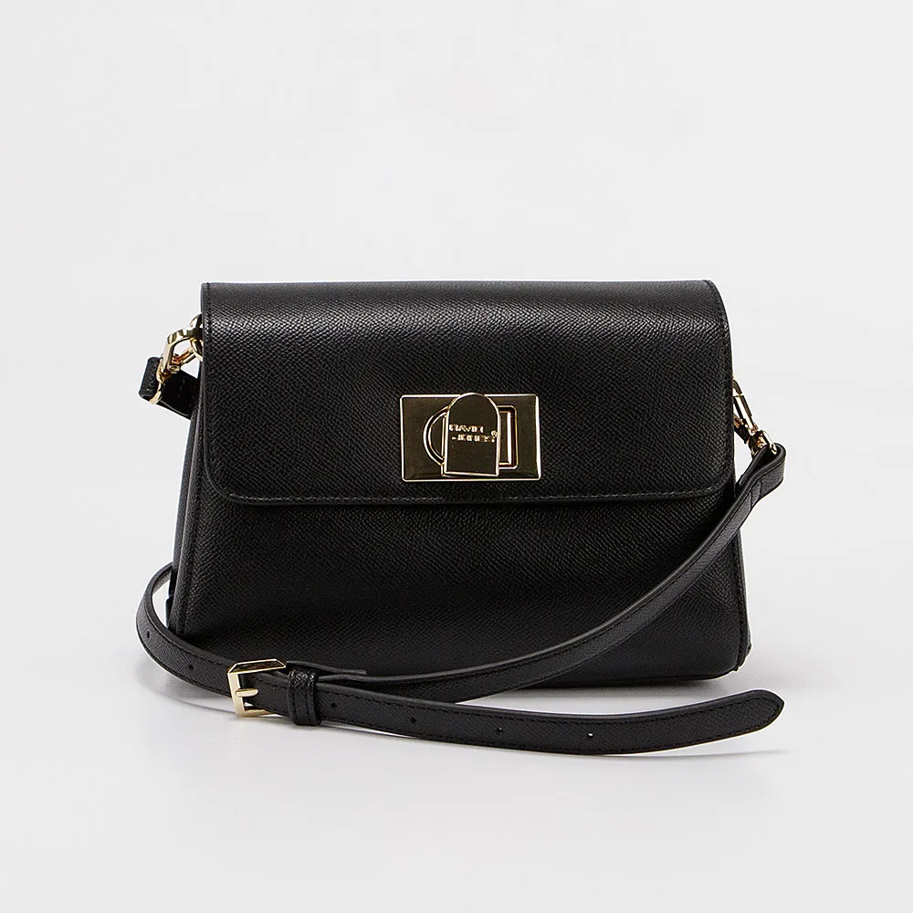 Сумка от торговой марки David Jones из искусственной кожи черного цвета. Модель со съемным регулируемым плечевым ремнем. Закрывается клапаном на поворотном замке. Два отделения с фирменной подкладкой. Переднее закрывается хлястиком на магнитной кнопке; внутри: два накладных кармана. Заднее отделение на молнии; внутри: карман на молнии. На задней стороне – карман на молнии.