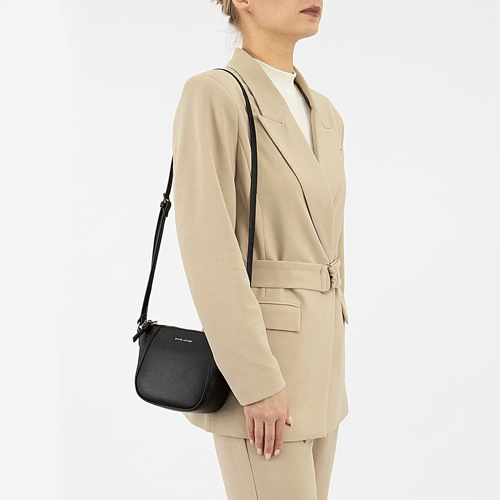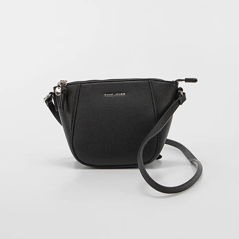 Сумка от торговой марки David Jones из искусственной кожи черного цвета. Модель со съемным регулируемым плечевым ремнем. Отделение на молнии. Внутри: фирменная подкладка, карман на молнии, накладной карман.