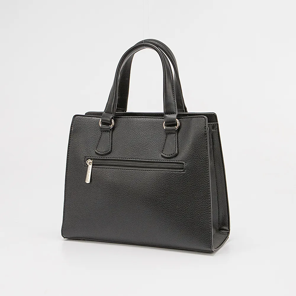 Сумка от торговой марки David Jones из искусственной кожи черного цвета. Модель с двумя ручками, декорированными подвеской, и съемным регулируемым плечевым ремнем. Три отделения, с фирменной подкладкой. Крайние фиксируются магнитной кнопкой. Среднее отделение на молнии; внутри: карман на молнии, накладной карман. На задней стороне – карман на молнии. Дно оснащено металлическими ножками для защиты от износа.