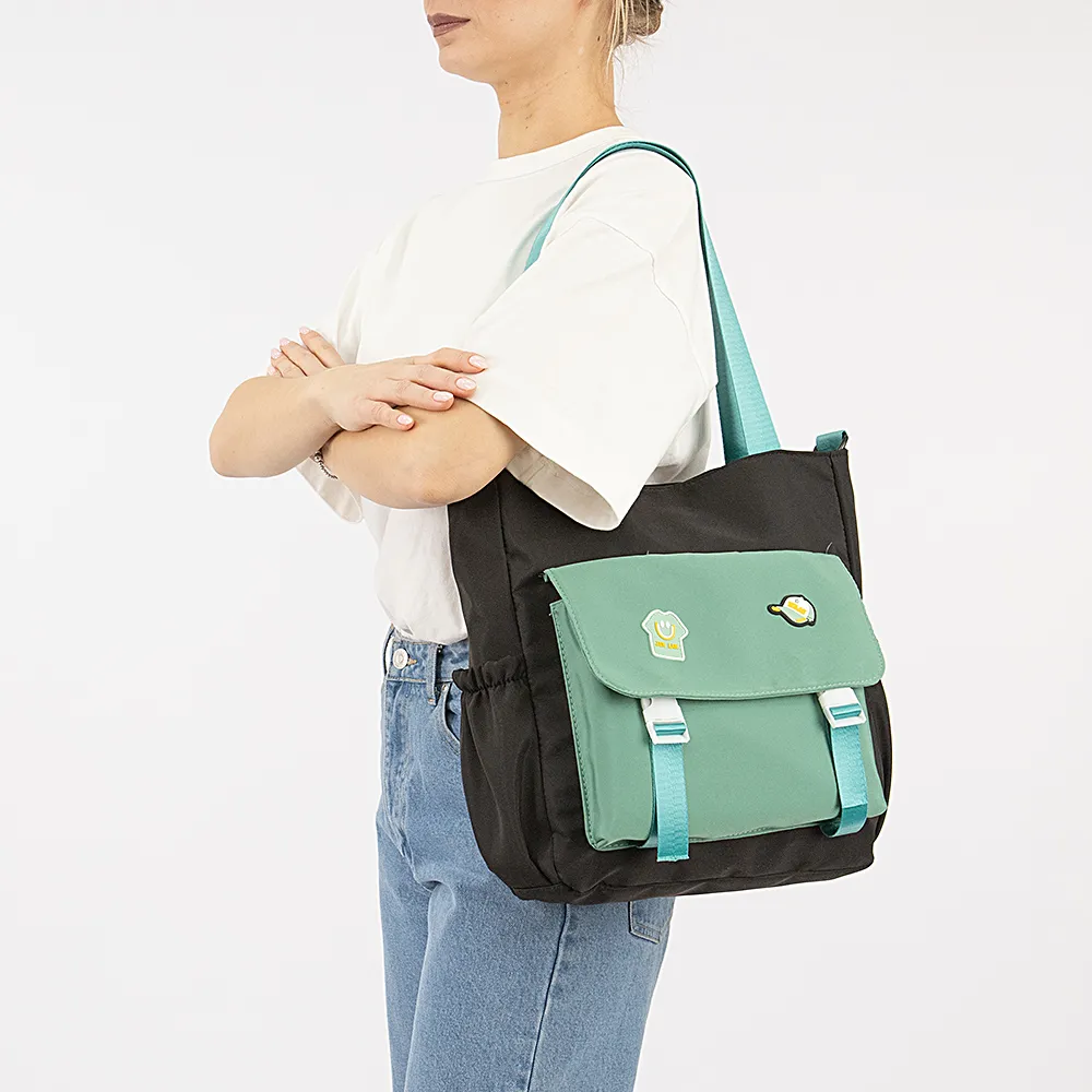 Сумка от торговой марки Passo Avanti из текстильного материала в сочетании черного и зеленого цвета. Модель с двумя удлиненными ручками, съемным регулируемым плечевым ремнем. Отделение на молнии. Внутри: текстильная подкладка, два накладных кармана. На лицевой стороне – накладной карман с застежками фастекс; декорирован прорезиненными нашивками. По бокам – накладной карман на резинке.
