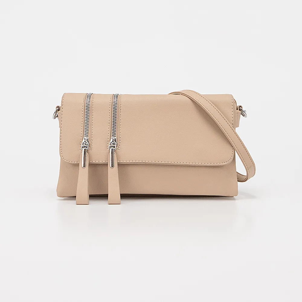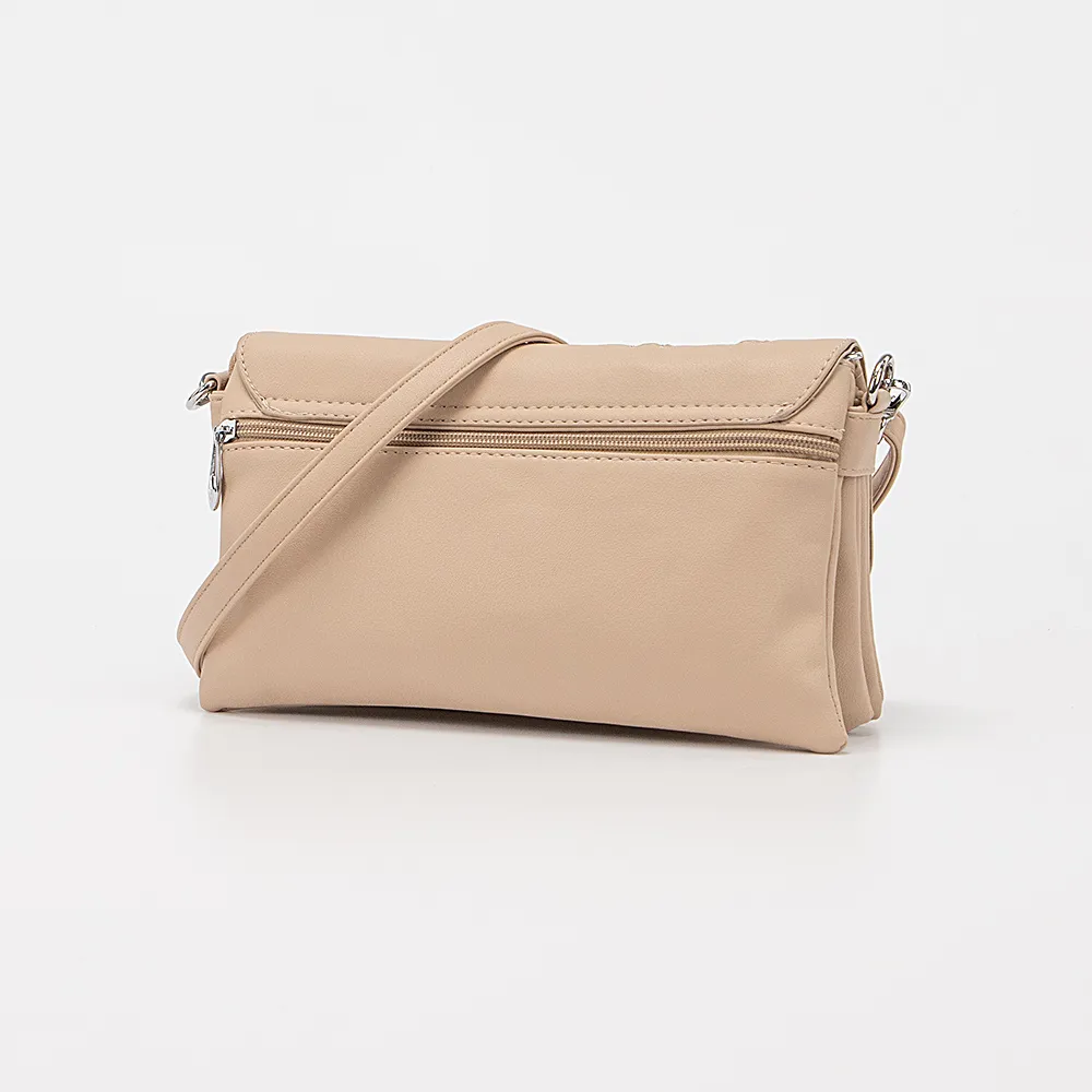 Сумка от торговой марки Passo Avanti из искусственной кожи бежевого цвета. Модель со съемным регулируемым плечевым ремнем. Закрывается клапаном на двух магнитных кнопках; клапан декорирован двумя декоративными молниями. Отделение закрывается молнией. Внутри: пять отсеков с текстильной подкладкой; средний отсек на молнии, в переднем – накладной карман. На задней стороне – карман на молнии.