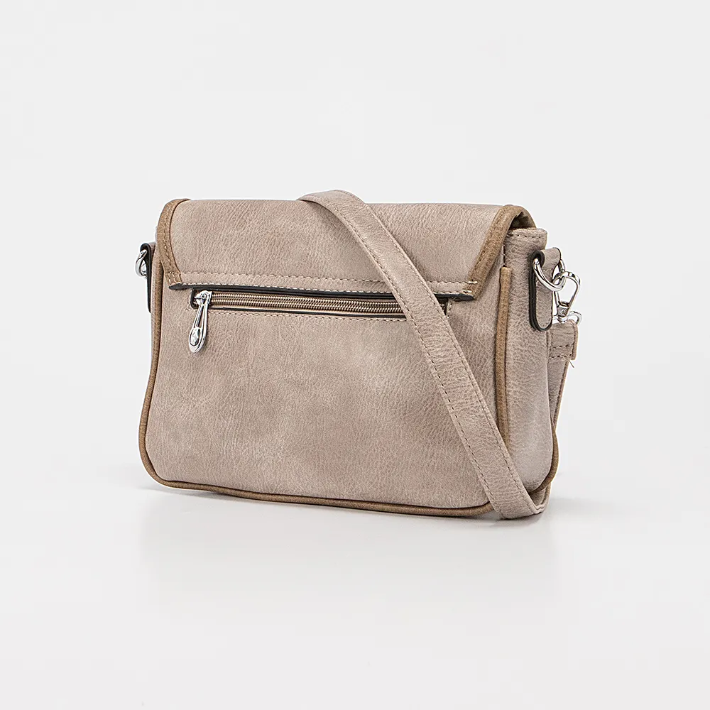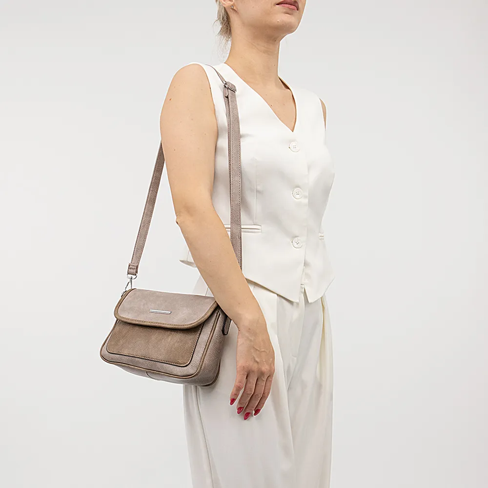 Сумка от торговой марки Passo Avanti из искусственной кожи в оттенках кофейного цвета. Модель со съемным регулируемым плечевым ремнем. Клапан на магнитной кнопке закрывает накладной карман и отделение на молнии. Внутри: текстильная подкладка, карман на молнии, накладной карман. На задней стороне – карман на молнии.