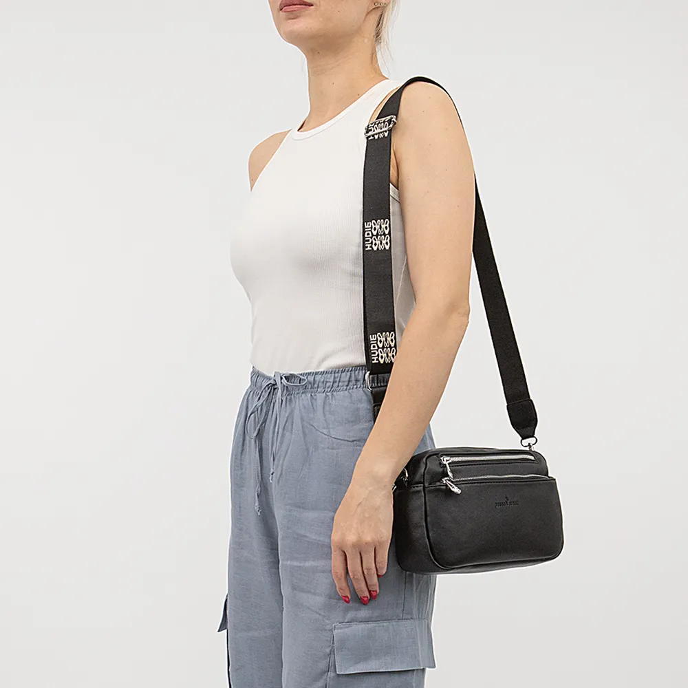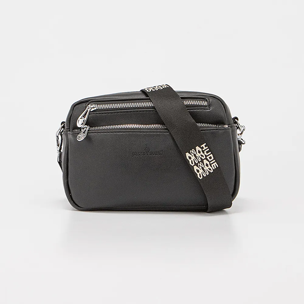 Сумка от торговой марки Passo Avanti из искусственной кожи черного цвета. Модель с широким съемным регулируемым плечевым ремнем, выполненным из текстильного материала с оригинальным рисунком. Отделение на молнии. Внутри: текстильная подкладка, карман на молнии, накладной карман. На лицевой стороне – два кармана на молнии. На задней стороне – карман на молнии.
