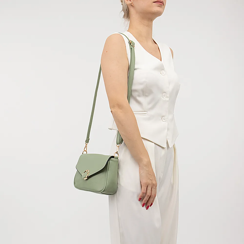 Сумка от торговой марки Passo Avanti из искусственной кожи мятно-зеленого цвета. Модель со съемным регулируемым плечевым ремнем. Закрывается клапаном на магнитной кнопке. Отделение на молнии. Внутри: текстильная подкладка, средник и карман на молнии, накладной карман. На задней стороне – карман на молнии.