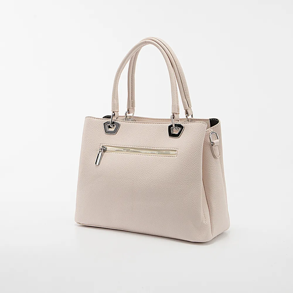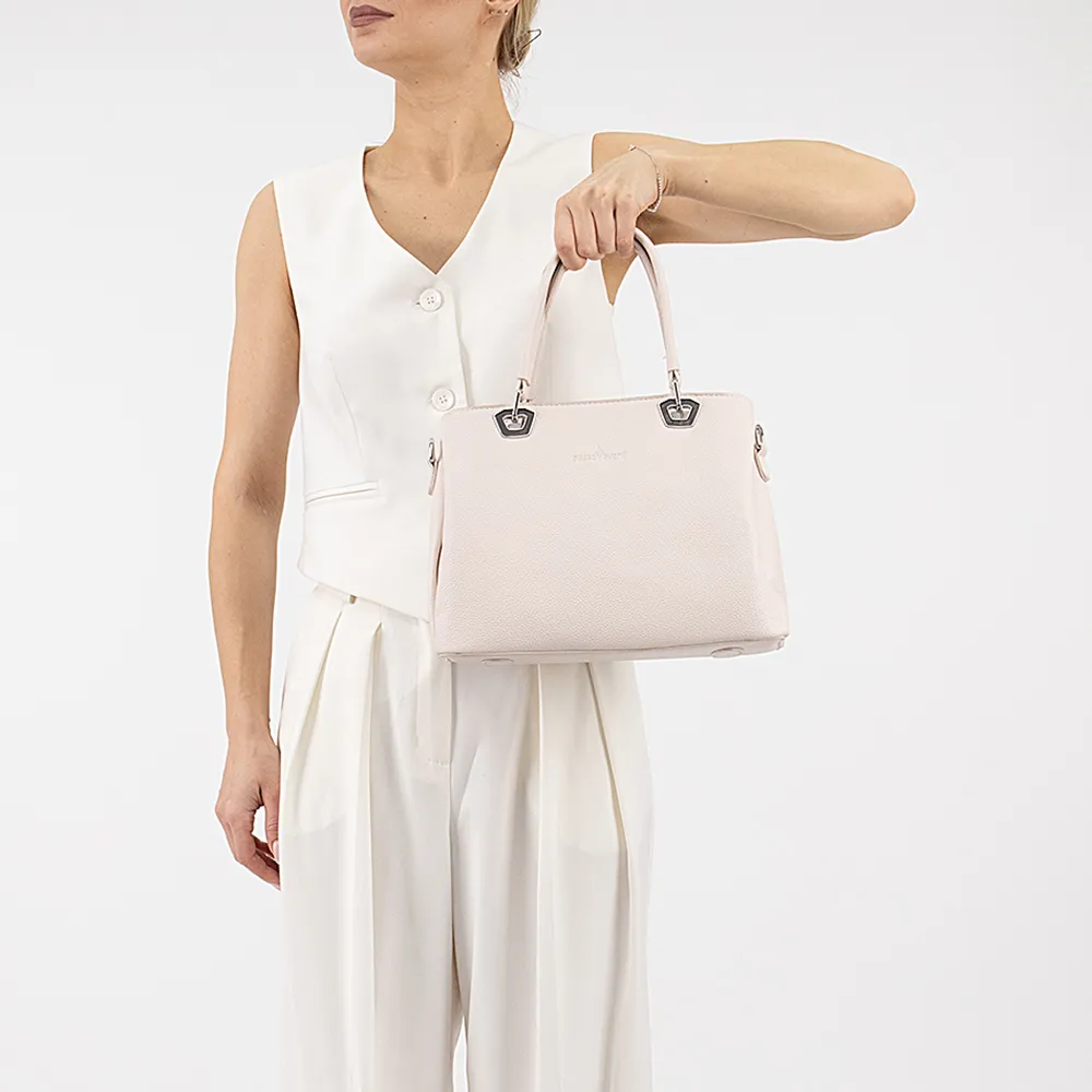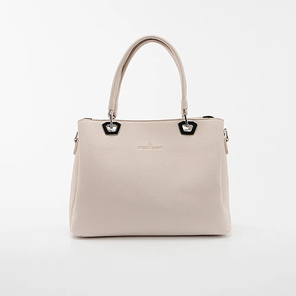 "Сумка от торговой марки Passo Avanti из искусственной кожи бежевого цвета. Модель с двумя удлиненными ручками. Закрывается молнией; широко раскрывается. Внутри: три отделения с текстильной подкладкой; в среднем – карман на молнии, накладной карман. На задней стороне – карман на молнии. На дне имеются нашивки для защиты от износа."