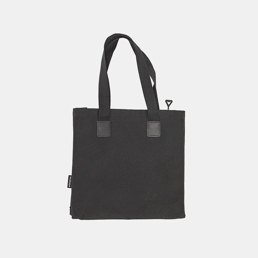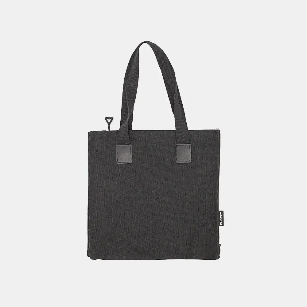 Сумка-шоппер от торговой марки Ecotope из плотного практичного текстильного материала черного цвета. Модель с двумя удлиненными ручками. Отделение на молнии. Внутри: без подкладки, навесной карман без застежки.