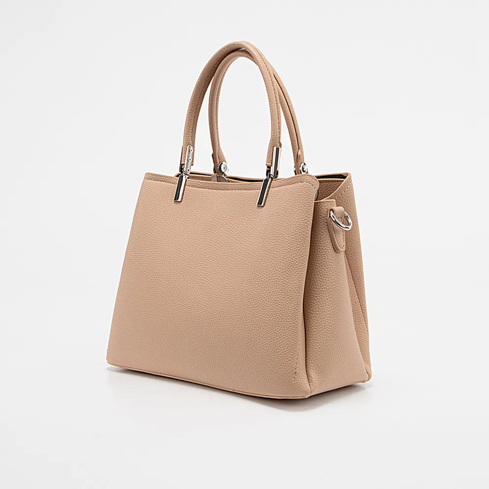 Сумка от торговой марки Passo Avanti из искусственной кожи бежевого цвета. Модель с двумя плотными ручками и съемными регулируемым плечевым ремнем. Три отделения с частичной подкладкой. Крайние фиксируются магнитной кнопкой. Среднее отделение на молнии. Внутри: карман на молнии. На дне имеются нашивки для защиты от износа.