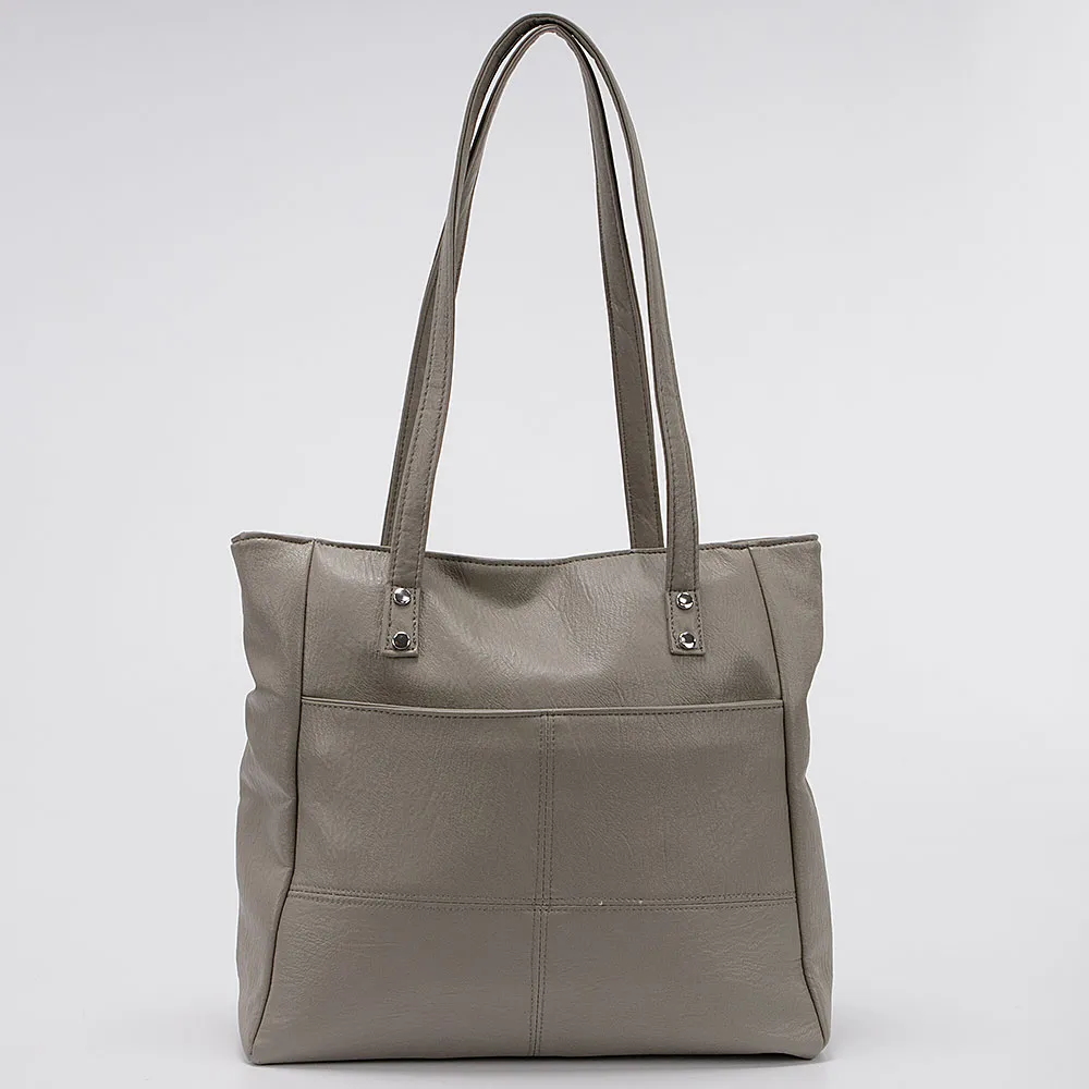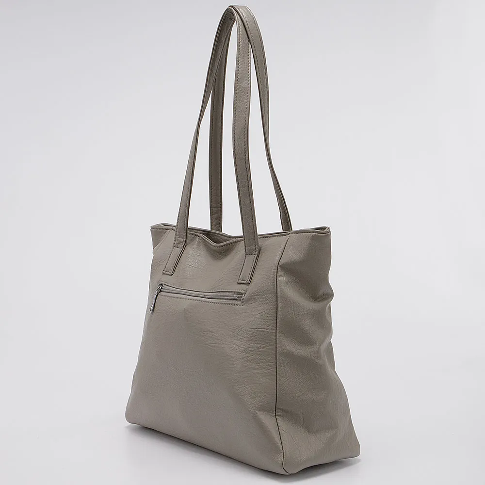 Сумка от торговой марки Passo Avanti из искусственной кожи светло-серого цвета. Вместительная модель с двумя удлиненными ручками. Отделение на молнии. Внутри: текстильная подкладка, средник и карман на молнии, два накладных кармана. На лицевой и задней стороне – карман на молнии.
