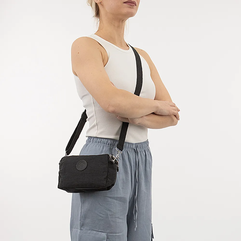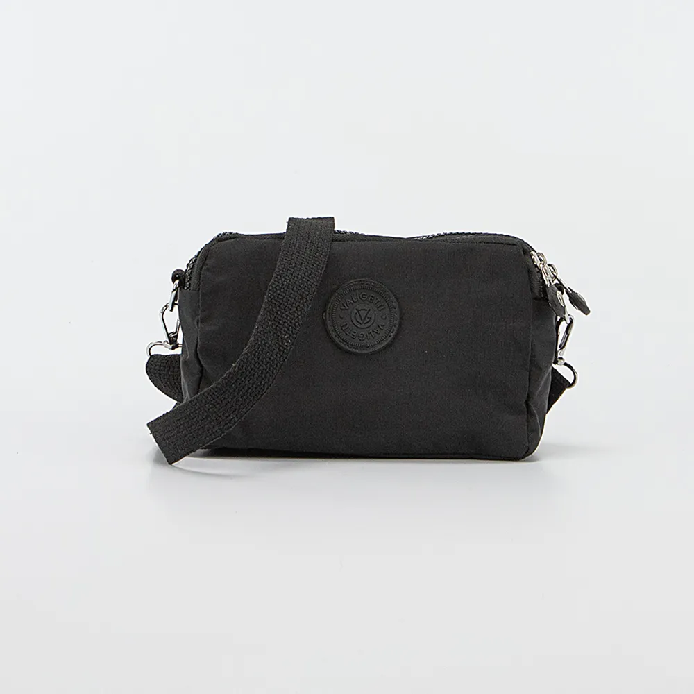 Сумка-планшет от торговой марки Valigetti из практичного текстильного материала черного цвета. Модель со съемным регулируемым плечевым ремнем и съемным ремешком для запястья. Три отделения на молнии, с текстильной подкладкой.