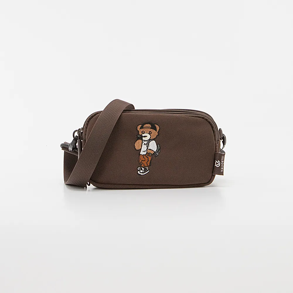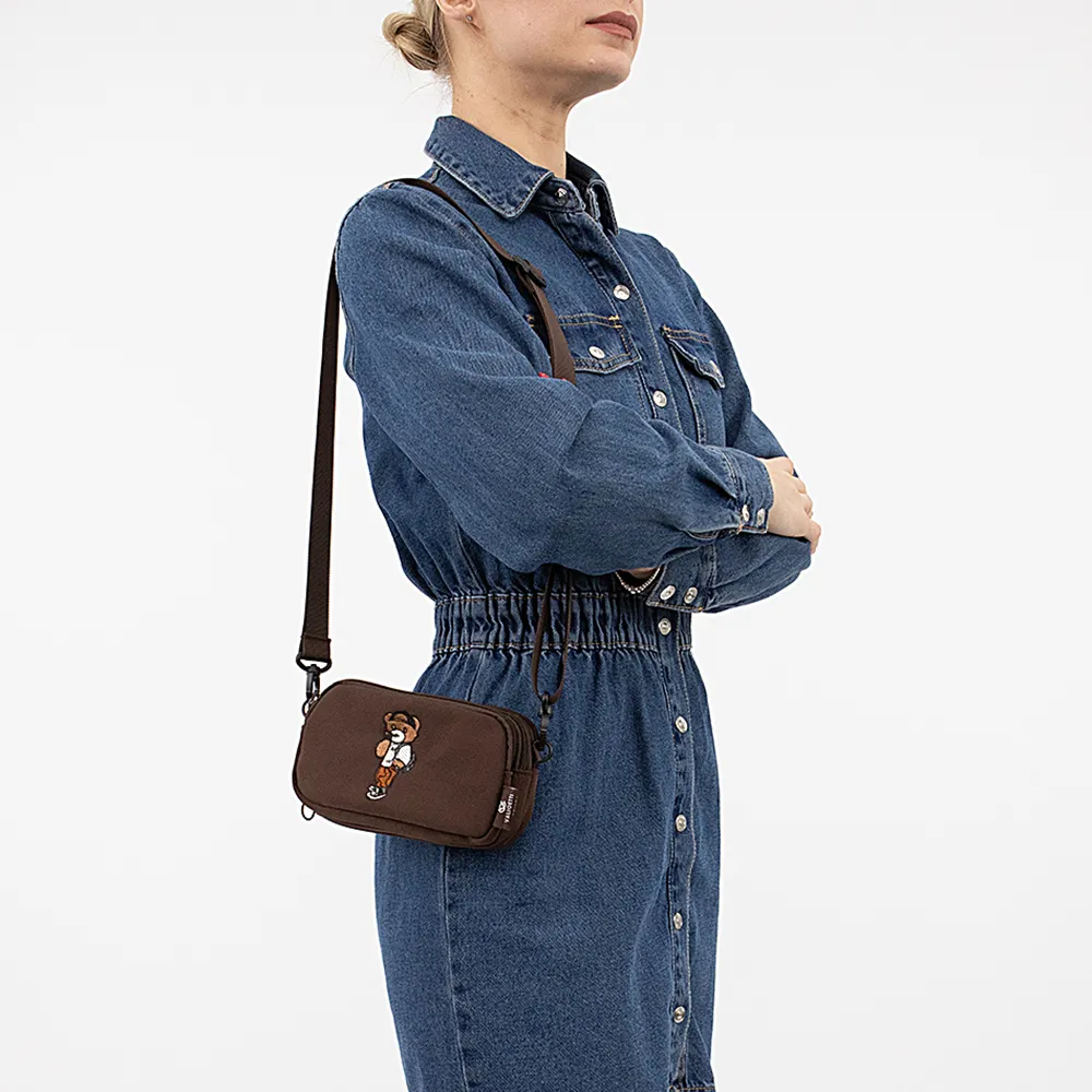 Сумка от торговой марки Valigetti из практичного материала коричневого цвета. Модель со съемным регулируемым плечевым и поясным ремнем, съемным ремешком для запястья. Три отделения на молнии, с текстильной подкладкой; в заднем – карман на молнии. Лицевая сторона декорирована аппликацией в виде мишки. Молодежная текстильная коллекция представлена моделями, выполненными из трех видов материалов: прочной ткани рип-стоп, блестящего и матового текстиля. Фурнитура повышенной прочности обеспечивает плавность движения замка и долговечность использования.