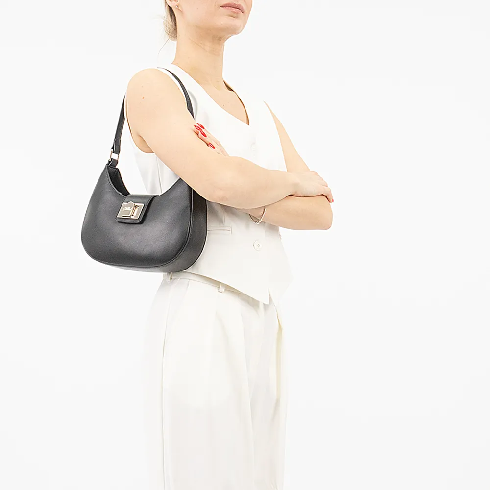Сумка от торговой марки David Jones из искусственной кожи черного цвета. Элегантная модель с удлиненной ручкой и съемным регулируемым плечевым ремнем. Закрывается хлястиком на поворотном замке. Отделение на молнии. Внутри: частичная фирменная подкладка, карман на молнии.