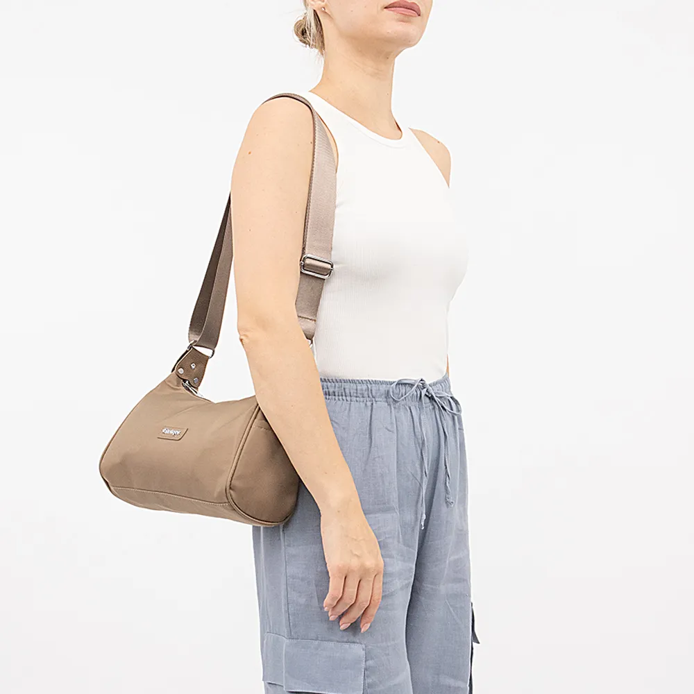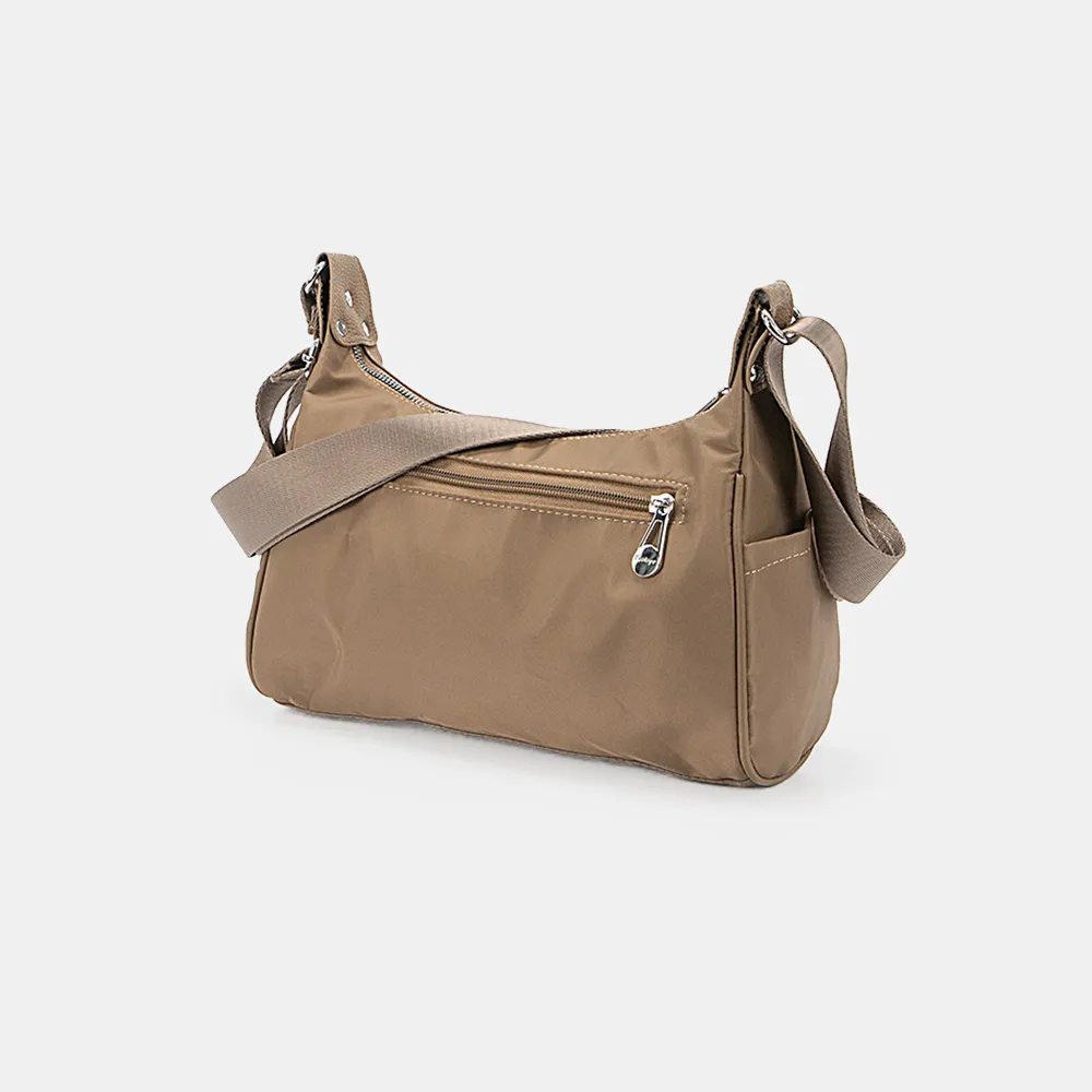 Сумка от торговой марки Ecotope из практичного текстильного материала бежевого цвета. Модель с широким несъемным регулируемым плечевым ремнем. Отделение на молнии. Внутри: текстильная подкладка, карман на молнии, накладной карман. По бокам – накладной карман. На задней стороне – карман на молнии.