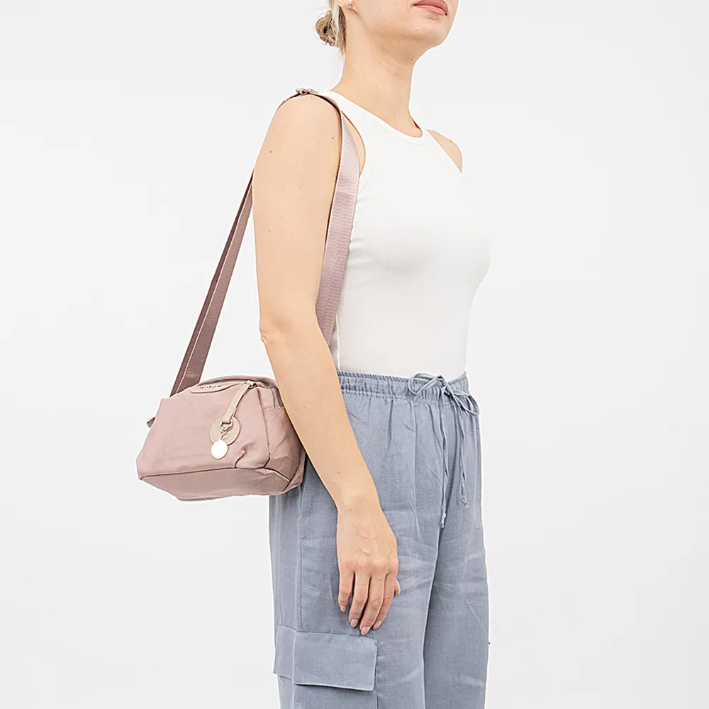 Сумка от торговой марки Ecotope из практичного текстильного материала бежевого цвета и вставками из искусственной кожи. Модель с несъемным регулируемым плечевым ремнем. Два отделения на молнии, с текстильной подкладкой. В заднем отделении – карман на молнии. На задней стороне – карман на молнии. Лицевая сторона декорирована оригинальной подвеской.
