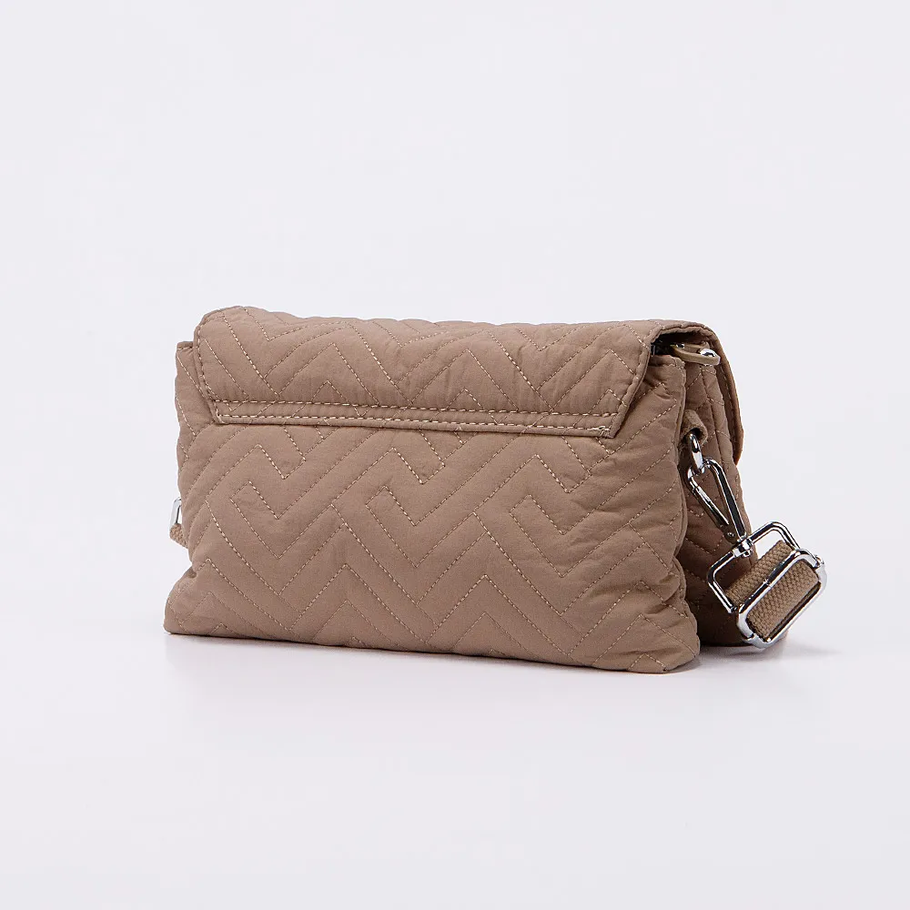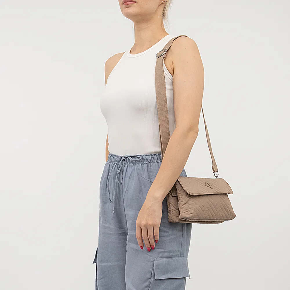 Сумка от торговой марки Valigetti из текстильного материала бежевого цвета с узорной стежкой. Модель со съемным регулируемым плечевым ремнем. Закрывается клапаном на магнитной кнопке. Отделение на молнии. Внутри: три отсека с текстильной подкладкой; в заднем – карман на молнии, в переднем – два накладных кармана.