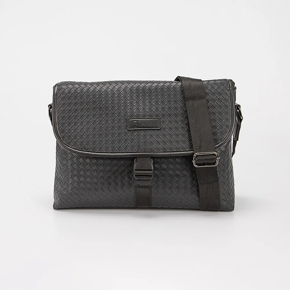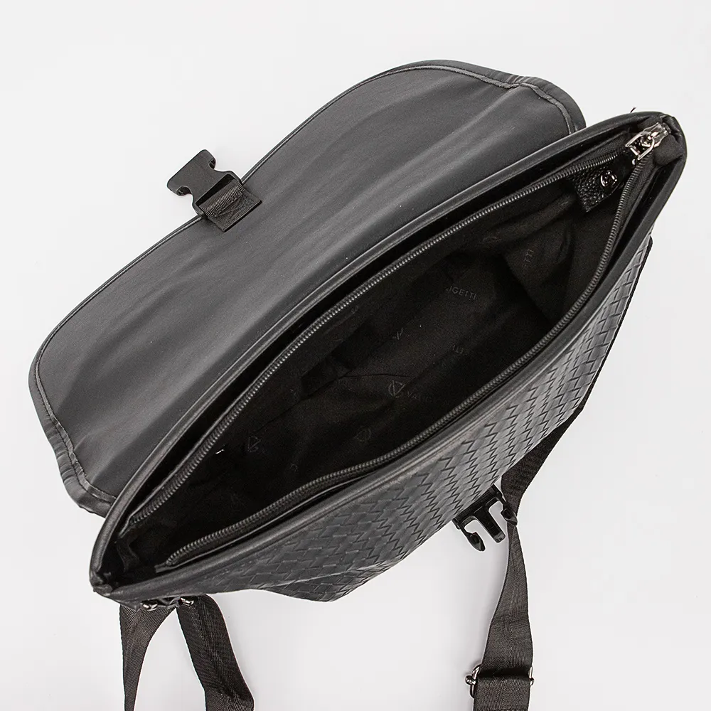 Сумка-планшет от торговой марки Valigetti из искусственной кожи черного цвета с тиснением под плетение. Модель с несъемным регулируемым плечевым ремнем, выполненным из текстильного материала. Закрывается клапаном на застежке фастекс. Отделение на молнии. Внутри: текстильная подкладка, карман на молнии.