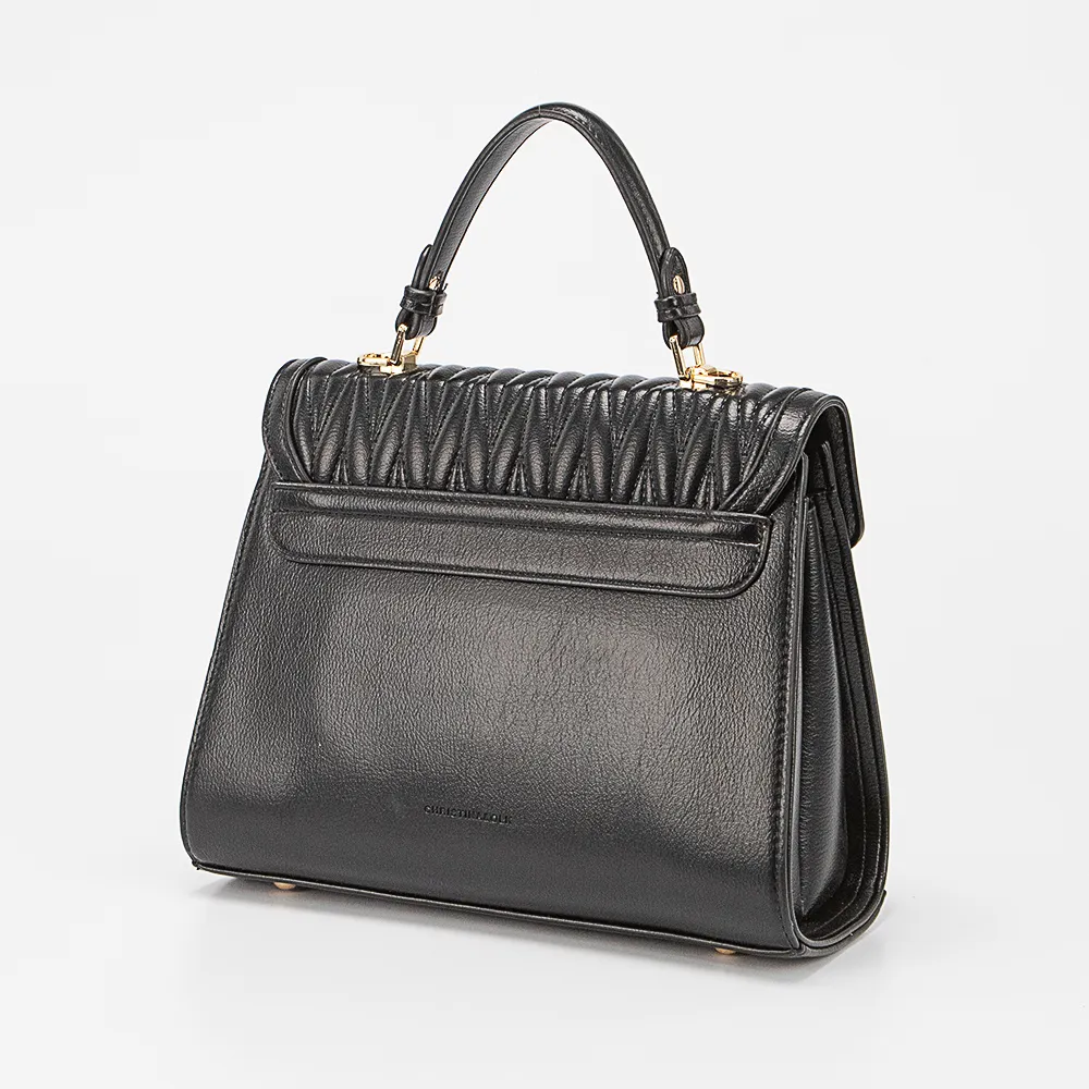 Сумка от торговой марки Cristina & Olk из искусственной кожи черного цвета. Лицевая сторона декорирована оригинальной мягкой стежкой. Модель среднего размера с одной ручкой и съемным регулируемым плечевым ремнем. Закрывается клапаном на поворотном замке. Внутри: текстильная подкладка, плотный средник, карман на молнии. Дно оснащено металлическими ножками для защиты от износа.