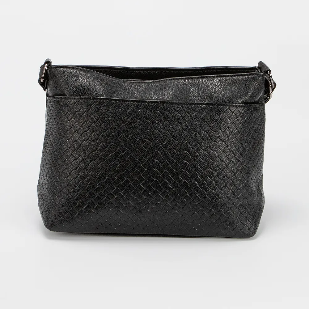 Сумка от торговой марки Passo Avanti из искусственной кожи с тиснением под плетение. Модель с несъемным регулируемым плечевым ремнем. Два отделения на молнии, с текстильной подкладкой; в одном из них – карман на молнии, в другом – накладной карман. На лицевой и задней стороне – карман на молнии.