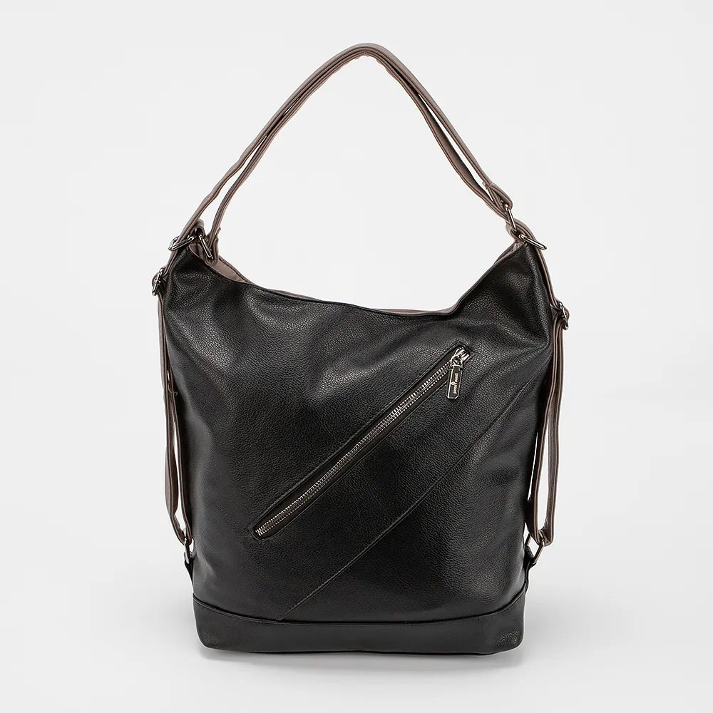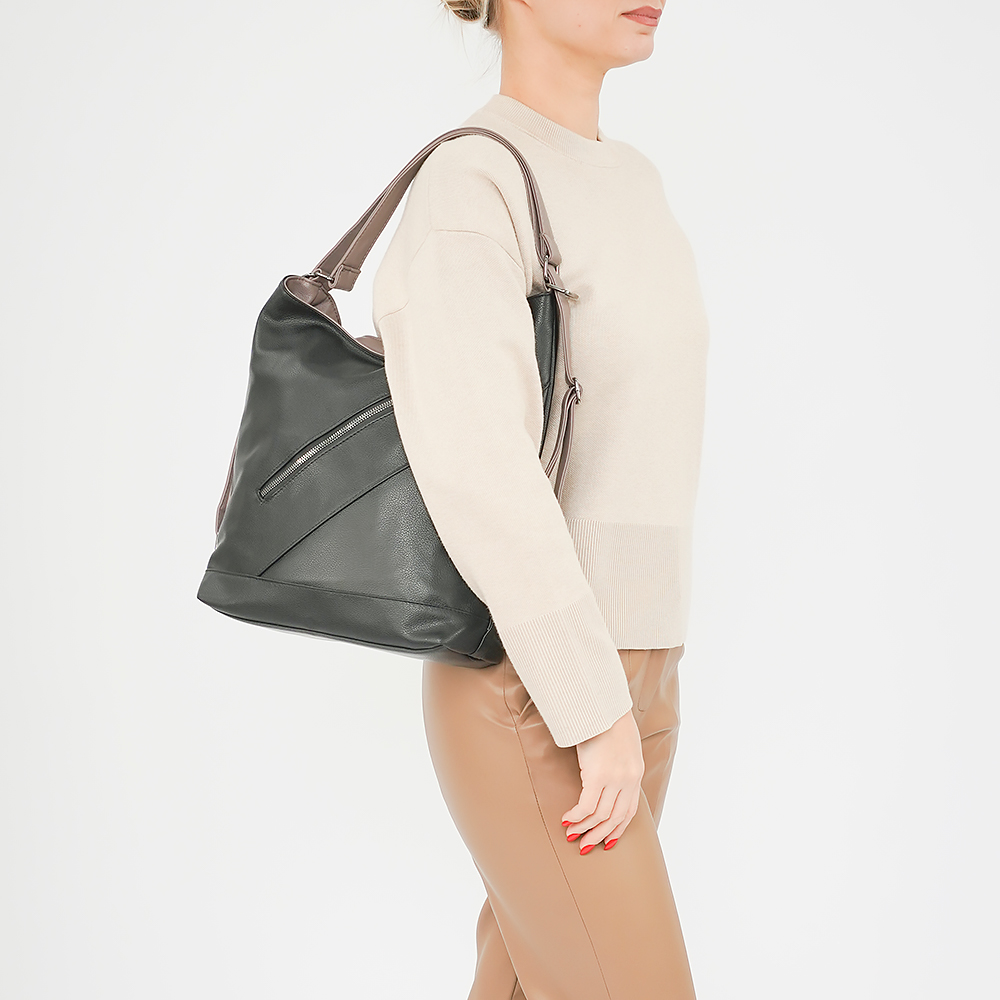 Сумка-рюкзак от торговой марки Passo Avanti из искусственной кожи. Модель с двумя ручками, стягиваемыми в плечевые лямки. Отделение на молнии. Внутри: текстильная подкладка, средник и карман на молнии, два накладных кармана. На лицевой и задней сторонах – карман на молнии.