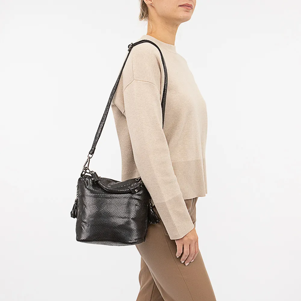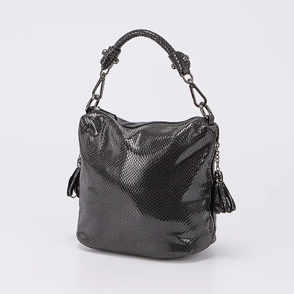 Сумка от торговой марки Passo Avanti из искусственной кожи черного цвета с эффектной лазерной обработкой и тиснением под рептилию. Модель со съемной ручкой и съемным регулируемым плечевым ремнем. Отделение на молнии. Внутри: фирменная подкладка, средник и карман на молнии, два накладных кармана. По бокам – карман на молнии с оригинальный пуллером-цепочкой.