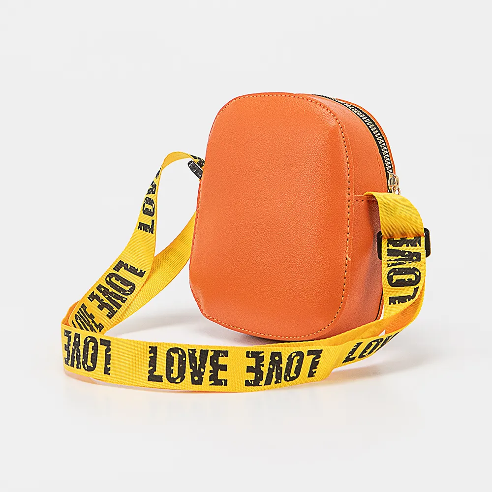 Детская сумочка от торговой марки Passo Avanti из искусственной кожи оранжевого цвета. Лицевая сторона декорирована аппликацией в виде котенка. Модель с широким ярким несъемным регулируемым плечевым ремнем из текстильного материала с текстовым принтом. Отделение на молнии; без подкладки.