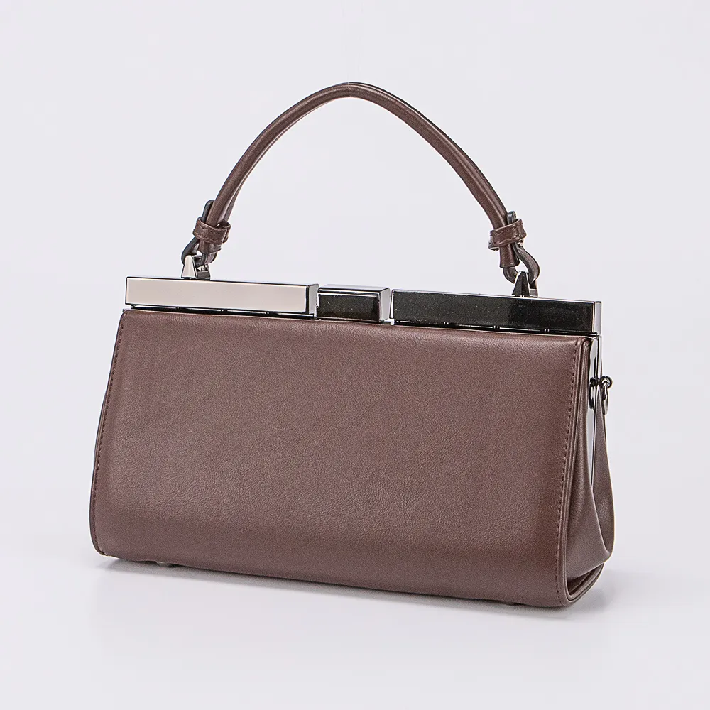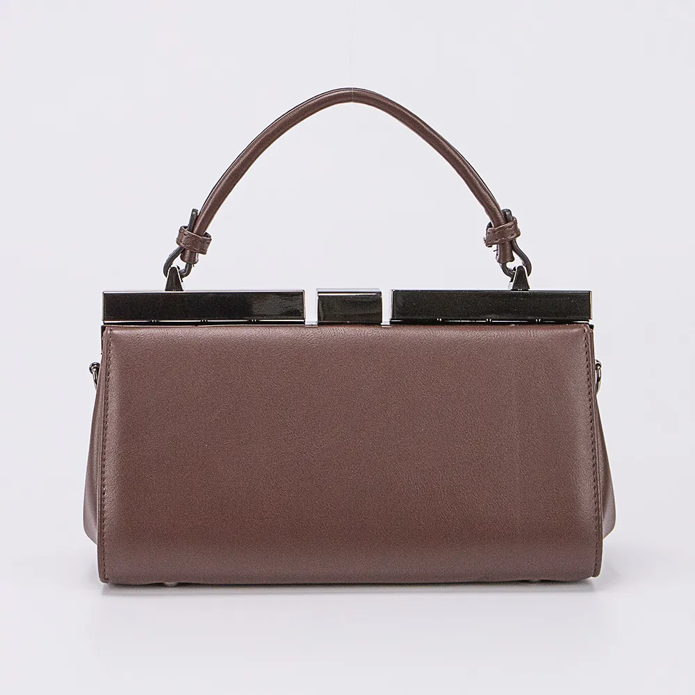 Сумка от торговой марки Marzia из искусственной кожи коричневого цвета. Модель с одной ручкой и съемным регулируемым плечевым ремнем. Имеет рамочный вид закрытия фермуар. Внутри отделения: фирменная подкладка, средник с карманом на молнии. Дно оснащено металлическими ножками для защиты от износа.