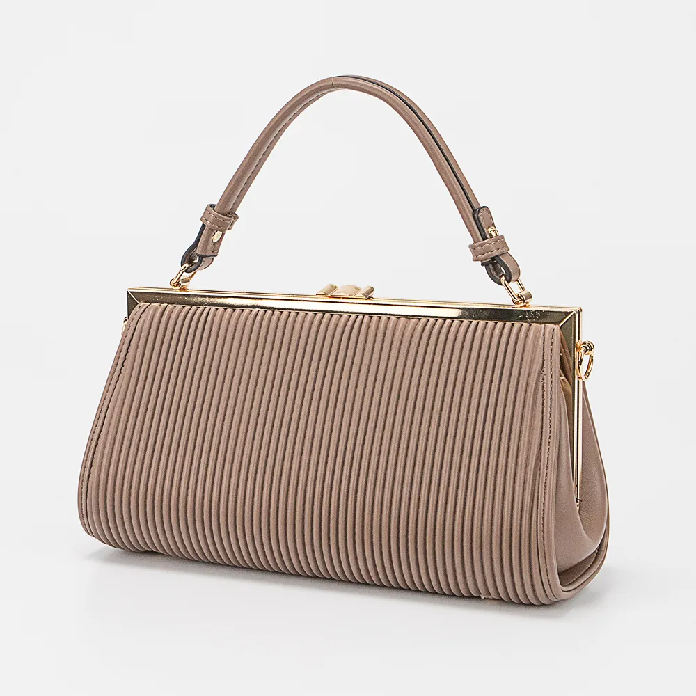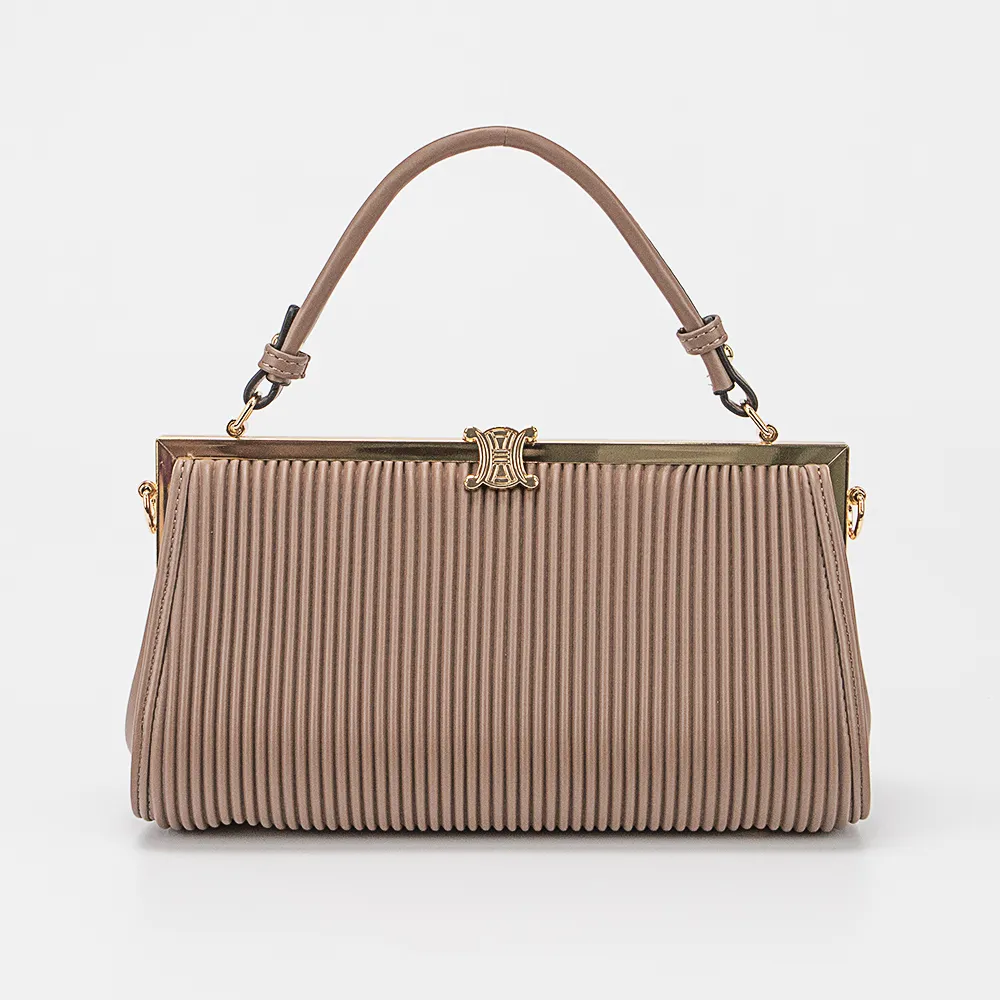 Сумка от торговой марки Marzia из искусственной кожи кофейного цвета. Декорирована изящной плиссировкой. Модель с одной ручкой и съемным регулируемым плечевым ремнем. Имеет рамочный вид закрытия фермуар с оригинальным декором. Внутри отделения: фирменная подкладка, средник с карманом на молнии.