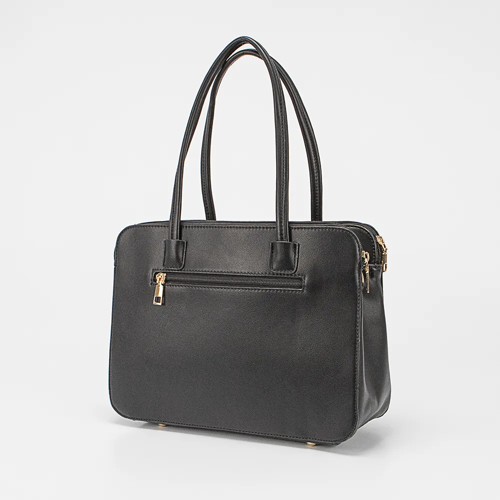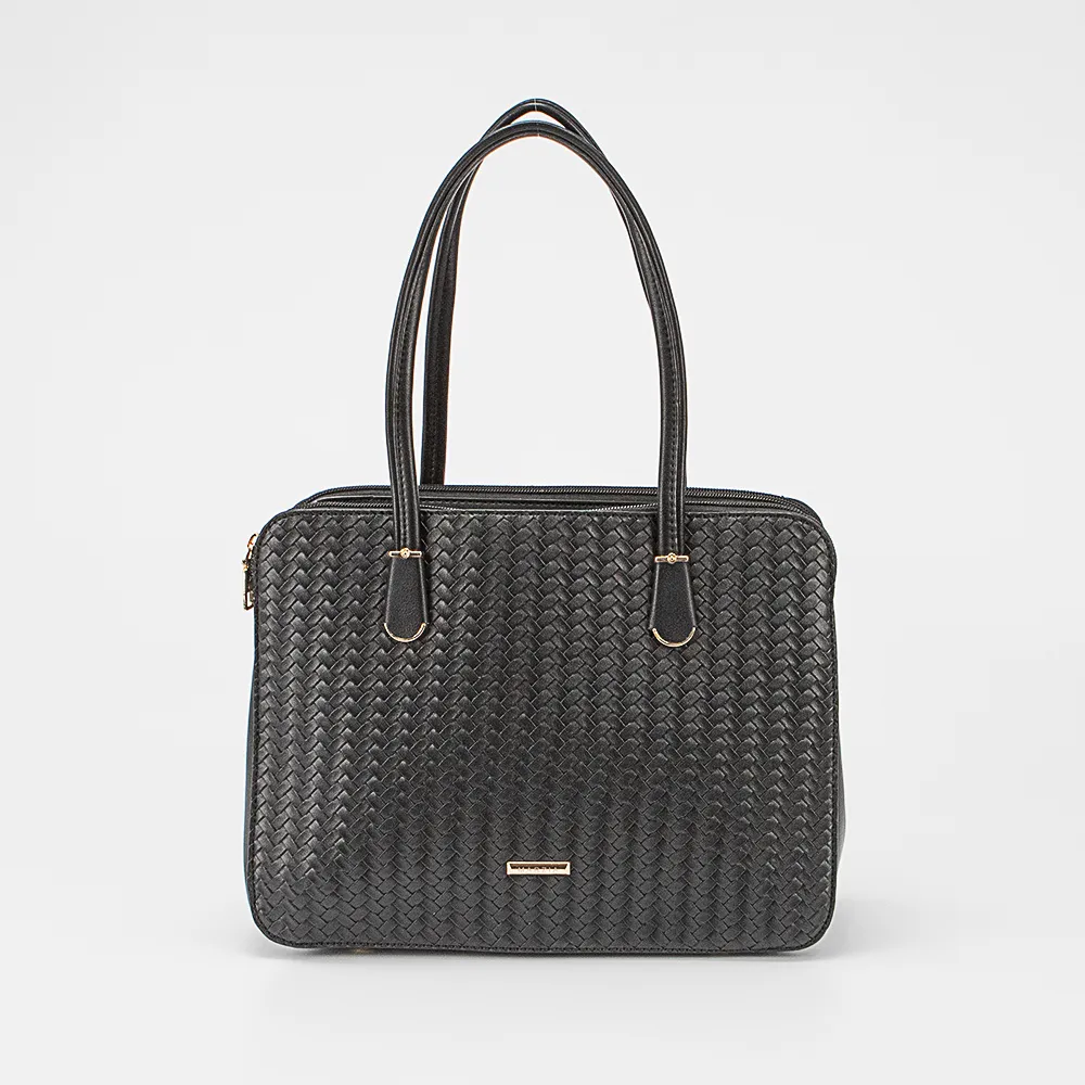 Сумка от торговой марки Marzia из искусственной кожи черного цвета. Лицевая сторона декорирована тиснением под плетение. Модель с двумя удлиненными ручками и съемным регулируемым плечевым ремнем. Три отделения на молнии, с текстильной подкладкой. В среднем отделении: средник и карман на молнии. На задней стороне – карман на молнии. Дно оснащено металлическими ножками для защиты от износа.